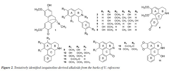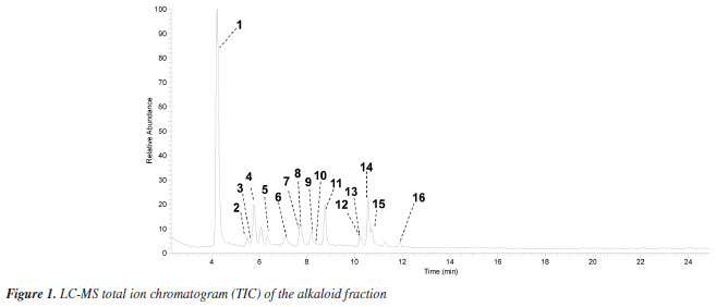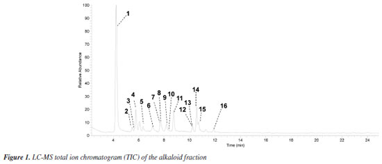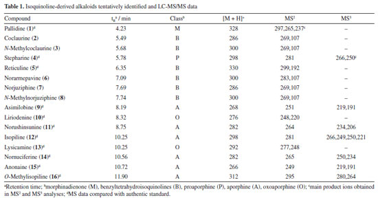 RESULTS AND DISCUSSION LC-MS analysis The alkaloid fraction of U. rufescens was analyzed using LC-MS/MS in positive ionization mode, and the fragmentation data were subsequently interpreted manually. The tentative identification of compounds 1-16 was based on the previously reported fragmentation pattern knowledge regarding benzyltetrahydroisoquinolines, proaporphine, and aporphinoids in species of the genus Unonopsis and other species of Annonaceae.7-12 These compounds were supposed as alkaloids based on the even m/z ions (Figures 1S-15S, Supplementary Material), indicating protonated structures containing only one nitrogen atom, a characteristic feature of isoquinoline-derived alkaloids.1-3 The LC-MS total ion chromatogram (TIC) of the alkaloid fraction (Figure 1) revealed a major peak (retention time (tR) = 4.23 min) corresponding to a protonated alkaloid at m/z 328, along with other minor peaks between 5.49 and 11.90 min, which contained protonated alkaloids ranging from m/z 266 to 312 (Table 1). The LC-MS/MS or LC-MS2 spectra of these compounds (Figures 16S-31S, Supplementary Material) were then interpreted manually.