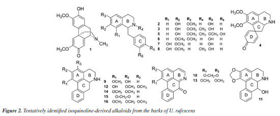 EXPERIMENTAL General experimental procedures Liquid chromatography coupled to tandem mass spectrometry analysis (LC-MS/MS) was performed using a system comprising an Accela chromatograph coupled with an LCQ ion trap mass spectrometer (Thermo Scientific, Waltham, MA, USA). Semi-preparative HPLC (high-performance liquid chromatography) analysis was carried out on a UFLC system (LC-6 AD pump; DGU-20A5 degasser; SPD-20AV UV detector; rheodyne injector; CBM-20A communication module) (Shimadzu, Columbia, MD, USA). Nuclear magnetic resonance (NMR) spectroscopy analysis was performed with an AVANCE III 600 NMR spectrometers (Bruker, Karlsruhe, Germany), operating at 14.1 T, observing 1H at 600.13 MHz. An analytical mill Q298A (Quimis, Diadema, SP, Brazil) was used to grind the sample. All solvents used for extraction, chromatography, and MS experiments were HPLC grade, purchased from Tedia (Fairfield, OH, USA), and the water was purified by a Milli-Q system. Deuterated methanol (CΔ3OD) (Cambridge Isotope, Tewksbury, USA) was used as solvent for NMR analysis. Authenticated standards of pallidine, stepharine, reticuline, asimilobine, liriodenine, norushinsunine, isopiline, lysicamine, nornuciferine, anonaine, and O-methylisopiline were sourced from the authors' laboratory.11,22 Plant material The trunk bark of U. rufecens was collected in the Esteio Farm (2º23'15.1"S 59º50'53.3"W) of the Projeto Dinâmica Biológica de Fragmentos Florestais (PDBFF), located in the Distrito Agropecuário da SUFRAMA, Manaus, Brazil, from specimen previously identified by Prof. Paul J. M. Maas. A voucher specimen (No. 3767) is deposited in the botany collection of PDBFF. Access to the plant material is registered in the Sistema Nacional de Gestão do Patrimônio Genético e do Conhecimento Tradicional Associado (SisGen) under code AE0F182. Alkaloid extraction and semi-preparative HPLC analysis The alkaloid fraction was obtained according to a previously reported methodology.7 Firstly, the plant material was powdered using an analytical mill. Then, the powdered trunk bark (2 g) was stirred with a vortex mixer with a mixture of 10% ammonium hydroxide (NH4OH) aqueous solution (20 mL) and dichloromethane (CH2Cl2) (20 mL) in a glass container. Subsequently, the organic phase was transferred to another glass container and stirred with a 10% acetic acid (CH3CO2H) aqueous solution (20 mL). Afterward, the aqueous phase was separated and treated with NH4OH until a pH of 10 was achieved. Then, this phase was extracted under vigorous stirring with CH2Cl2 (20 mL). Finally, the organic phase was dried over anhydrous sodium sulfate, transferred to a new container, and the solvent was evaporated to dryness under a nitrogen gas stream, yielding the alkaloid fraction (5.6 mg, 0.28%). The procedure was repeated two more times, yielding a total of 13.4 mg of alkaloid fraction. A part of the alkaloidal fraction (10 mg) was subjected to fractionation by semi-preparative HPLC using 0.01% trifluoroacetic acid aqueous solution (A) and methanol (B) as mobile phases. Elution was performed using a flow of 4.5 mL min-1 and through a gradient of 30% B to 80% B over 20 min. A C18(2) column (250 × 10 mm i.d., 5 μm) (Phenomenex, Torrance, CA, USA) was employed on the fractionation being monitored with UV channels at 250 and 280 nm. A single injection was carried into the column in MeOH (50 μL) affording compound 1 (4.6 mg). LC-MS/MS analysis The alkaloid fraction was diluted to 1 mg mL-1 in MeOH and analyzed (10 µL, injection volume) with an Accela HPLC system (Thermo Scientific) equipped with a Phenomenex Luna C18(2) column (150 mm × 4.6 mm i.d., 5 µm) (Torrance, CA, USA). The mobile phase consisted of 0.01% trifluoroacetic acid aqueous solution (A) and ACN (B). Elution was performed using a flow of 1 mL min-1 and through a gradient of 20% B to 80% B over 15 min, followed by 10 min at 80% B. The outlet from the column was connected through a split valve (flow of 500 µL min-1) to a LCQ fleet mass spectrometer (Thermo Scientific). Ionization was performed with an APCI source operating at positive ion mode. The ionization settings were as follows: positive polarity, source voltage, 6 kV, discharge current, 5 µA; vaporizer temperature, 330 ºC; sheath gas pressure, 35 arbitrary unit (arb); ion sweep gas pressure, 0.0 arb; aux gas pressure, 15 arb; capillary temperature, 250 ºC; tube lens offset, 110 V; skimmer offset, 0 V; mass range, m/z 100 to 800. Helium was used as collision gas, and the MSn spectra were obtained using collision energies ranging from 20 to 27%. Analysis of authenticated standards by DI-MS For direct injection mass spectrometry (DI-MS) analysis, stock solutions (1 mg mL-1) of the authenticated standards of pallidine, stepharine, reticuline, asimilobine, liriodenine, norushinsunine, isopiline, lysicamine, nornuciferine, anonaine, and O-methylisopiline were prepared in HPLC-grade MeOH. Aliquot (10 µL) of the stock solution was subsequently transferred to vials containing 1 mL of MeOH. Finally, the diluted solution (10 ppm) was analyzed by direct injection into a LCQ fleet mass spectrometer (Thermo Scientific) equipped with an APCI source operating in positive polarity mode. The ionization settings were the same as those of the LC-MS/MS analysis.
