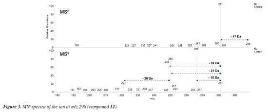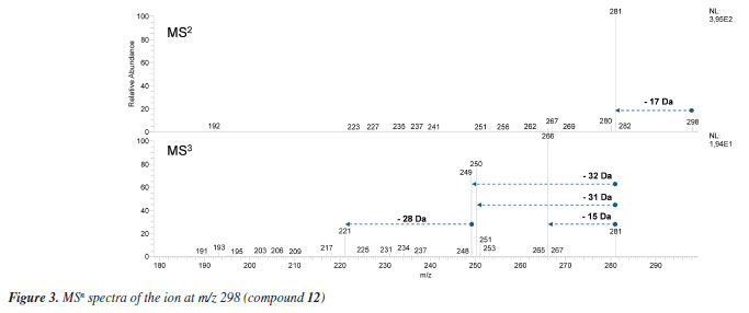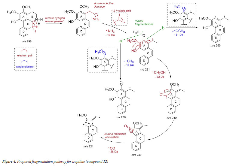 The LC-MS2 spectra of compounds 2 (m/z 286) and 3 (m/z 300) presented an initial loss of 17 Da (-NH3) (m/z 286 → 269) and 31 Da (-NH2CH3) (m/z 300 → 269), respectively, along with a diagnostic ion of benzylisoquinoline skeletons at m/z 107. This evidence has been previously associated with benzylisoquinolines with and without an N-methyl group, and containing hydroxyl and methoxyl groups at ring A, as well as a hydroxyl group at the C ring.7,8,12 The fragmentation of compounds 2 and 3 were consistent with the benzylisoquinoline alkaloids coclaurine (2) and N-methylcoclaurine (3), both previously reported in Annonaceae species.8 The same fragmentation pattern was observed in the LC-MS2 spectra of compounds 7 (m/z 286) and 8 (m/z 300), with these being tentatively identified as norjuziphine (7) and N-methylnorjuziphine (8).7 For these compounds, the elution order was assigned based on the previous behavior of compounds 2 and 7 on C-18 columns.4 Compound 6 (m/z 300), an isomer of compounds 3 and 8, presented in the LC-MS2 spectrum an initial loss of 17 Da (-NH3) (m/z 300 → 283) and the diagnostic ion at m/z 107. This evidence suggests a benzylisoquinoline skeleton without an N-methyl group, containing two methoxyl groups at ring A, along with a hydroxyl group at the C ring. Thus, compound 6 was tentatively identified as norarmepavine (6).23 Finally, the LC-MS2 spectrum of compound 5 (m/z 330) presented a discrete fragment at m/z 299 and a base peak fragment ion at m/z 192 (m/z 300 → 192). This fragmentation pattern is consistent with the benzylisoquinoline alkaloid reticuline (5).7,8,11 The LC-MS2 spectra of compounds 10 (m/z 276) and 13 (m/z 292) presented evidence of oxoaporphine alkaloids, such as a loss of -28 Da (m/z 276 → 248) and -15 Da (m/z 292 → 277), and were tentatively identified as liriodenine (10) and lysicamine (13) through comparison of their MS2 spectra with those reported in the literature.24 On the other hand, the LC-MS2 mass spectra of compounds 4, 9, 11, 12, 14, 15, and 16 presented primarily only the base peak as useful information, providing no additional data to assist in their tentative identifications. Although the m/z information of these compounds and the initial losses provided strong evidence of aporphine alkaloids previously reported in species of the Unonopsis group, such as U. duckei,10,12 U. floribunda,22 U. guatterioides,9,12 U. stipitata,25 O. amazonicum,7 and Bocageopsis pleiosperma,11 an additional MS3 analysis was conducted (Figures 32S-38S, Supplementary Material). The MS2 and MS3 spectra of compounds 4 (m/z 298), 14 (m/z 282), and 16 (m/z 312) presented fragmentation pathways consistent with proaporphine and aporphine alkaloids that have adjacent methoxyl groups at ring A and an absence of N-methyl groups.7-12 Their losses were assigned as 17 Da (-NH3) (m/z 298 → 281; m/z 282 → 265; m/z 312 → 295), followed by competitive losses of 15 Da (-∙CH3) (m/z 281 → 266; m/z 265 → 250; m/z 295 → 280) and 31 Da (-∙OCH3) (m/z 281 → 250; m/z 265 → 234; m/z 295 → 264). Therefore, the fragmentation patterns observed for compounds 4, 14, and 16 were consistent with the proaporphine alkaloid stepharine (4)11 and the aporphine alkaloids nornuciferine (14)7-11 and O-methylisopiline (16),7 respectively. On the other hand, the MS2 and MS3 spectra of compound 9 (m/z 268) presented a fragmentation pathway consistent with aporphine alkaloids that have adjacent hydroxyl and methoxyl groups at ring A and the absence of N-methyl groups.7-12 Thus, an initial loss of 17 Da (-NH3) was observed (m/z 268 → 251), followed by subsequent losses of 32 Da (-CH3OH) (m/z 251 → 219) and 28 Da (-CO) (m/z 219 → 191). This fragmentation pattern is consistent with the aporphine alkaloid asimilobine (9).7-12 The MS2 and MS3 spectra of compound 11 (m/z 282) presented a fragmentation pathway consistent with a 7-hydroxyaporphine alkaloid containing a methylenedioxy group at ring A and the absence of an N-methyl group.7 For this compound, an initial loss of 18 Da (-H2O) was observed (m/z 282 → 264), followed by subsequent losses of 30 Da (-CH2O) (m/z 264 → 234) and 28 Da (-CO) (m/z 234 → 206). This fragmentation is coherent with the aporphine alkaloid norushinsunine (11).7 Moreover, compound 15 (m/z 266) presented MS2 and MS3 spectra similar to compound 11, with only the first loss being different (17 Da instead of 18 Da). The subsequent losses of 30 Da (-CH2O) (m/z 249 → 219) and 28 Da (-CO) (m/z 219 → 191) confirmed compound 15 as anonaine.7-12 Finally, the MS2 and MS3 spectra (Figure 3) of compound 12 (m/z 298) presented a mixed fragmentation pathway consistent with an aporphine alkaloid that has adjacent hydroxyl and methoxyl groups, as well as adjacent methoxyl groups at ring A, in addition to the absence of an N-methyl group. This hypothesis was considered due to the competitive losses of 15 Da (-∙CH3) (m/z 281 → 266), 31 Da (-∙OCH3) (m/z 281 → 250), and 32 Da (-CH3OH) (m/z 281 → 249), which occurred after the initial loss of 17 Da (-NH3) (m/z 298 → 281) (Figure 3). Another evidence was the loss of 28 Da (-CO) (m/z 249 → 221) occurring after the loss of 32 Da (-CH3OH). This fragmentation pattern is consistent with the aporphine alkaloid isopiline (12).7 Since mixed fragmentation pathway for aporphine alkaloids is uncommon, a proposed fragmentation pathway for this type of aporphine skeleton is presented in Figure 4.