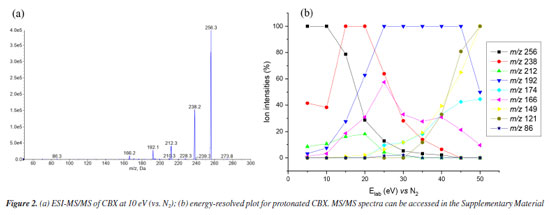 RESULTS AND DISCUSSIONS Mass spectrometry analysis of caramboxin reveals important aspects of the dissociation of protonated molecules. The loss of 18 u was observed as an in-source dissociation event from protonated molecule, [M + H]+, with m/z 256. Additionally, the product ion at m/z 238, [M + H-18]+, was detected in all MS/MS spectra, as shown in Figure 2. The significant intensity of the 18 u elimination observed without applied collision energy supports the data previously reported by Garcia-Cairasco et al.5 In that study, the authors discussed that the ring closure leading to the formation of the m/z 238 ion, [M + H-18]+, is facilitated and may occur through an irreversible process. They stated that, once the lactam ring is formed, the product loses its toxic activity, which explains the absence of the toxin in processed samples. Furthermore, other fragment ions were observed during high-resolution analysis, including m/z 212, 192, and 166, which motivated us to conduct the present study.