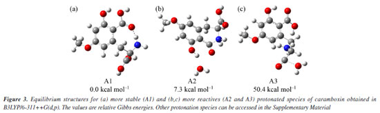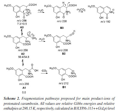 EXPERIMENTAL Chemicals High-performance liquid chromatography (HPLC)-grade methanol and analytical-grade acetic acid were purchased from J.T. Baker (Phillipsburg, USA), and the water was distilled and purified using a Millipore Milli-Q Plus system (Bedford, USA). Caramboxin was obtained as reported by Garcia-Cairasco et al.5 Mass spectrometry analysis ESI-MS/MS analyses were performed using both low-resolution and high-resolution instruments. Low-resolution experiments were conducted on an AB API 3200 mass spectrometer (Sciex, Bremen, Germany) equipped with a quadrupole analyzer (QqQ). All analyses were carried out in positive ion mode, with the capillary voltage set at 5.5 kV. Fragmentation experiments were performed on the protonated molecule [M + H]+ using collision-induced dissociation (CID), with collision energies ranging from 0 to 50 eV. For high-resolution analysis, a timsTOF Flex MALDI-2 mass spectrometer was used, operating with an ESI source and collision energies ranging from 5 to 30 eV. Computational studies Computational studies were performed using the Gaussian 09 and Gaussview (version 4.1, 2000-2006) programs.16 Equilibrium geometries and harmonic vibrational frequencies were calculated at the B3LYP/6-311++G(d,p) level.17,18 Recently, a benchmark study by Bhatia19 reaffirmed that the B3LYP method is the most suitable for calculating proton affinity (PAs) in compounds containing nitrogen, oxygen, and carbon. Our choice for B3LYP was based on previous studies20,21 with caramboxin (CBX), which have been demonstrated good results for geometric analysis of this natural compound. The most stable conformers of CBX were previously described by using B3LYP/6-31+G(d,p). Based on these findings, our study began with the reoptimization of the two most stable conformers described by Pichierri21 at the B3LYP/6-311++G(d,p) level. The search for the most reactive protonation site was conducted by analyzing atomic polar tensor (APT) and Merz-Singh-Kollman (MK) atomic charges22 and calculating proton affinity (PA) and gas-phase basicities (GB) values for the possible sites.23,24 PA and GB values were calculated using the B3LYP method, following benchmark studies by Vessecchi and Galembeck,25 as well as other studies26-28 involving natural and synthetic products. PA and BG were calculated through a protonation reaction (M + H+ → MH+) by computing the enthalpies and Gibbs energies at 298.15 K, respectively from this reaction.29 Mass spectra were predicted using the web server CFM-ID 4.030-32 and compared with those obtained experimentally via ESI-MS/MS. Fragmentation mechanisms were proposed based on the identified reactivity sites, and the relative energies of the main fragment ions were calculated at the B3LYP/6-311++G(d,p) level.