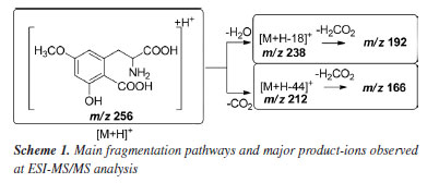 A summary of the main product ions is depicted in Scheme 1. Two alternative pathways for the fragmentation of [M + H]+ can be observed: one involving the elimination of 18 u and the other via direct loss of CO2. The high occurrence of [M + H-18]+ in the MS/MS spectra suggests that the elimination of H2O is a favored process.