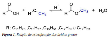 PARTE EXPERIMENTAL Preparação do molde para simulação de impressões digitais A confecção do molde iniciou-se com o acondicionamento da massa de modelar (Massinha SOFT, Acrilex) sobre uma superfície de vidro, seguida pela pressão do dedo polegar direito de um doador sobre a massa, de maneira a modelar a impressão digital com uma boa definição das linhas papilares.29 Após a formação do molde, a resina de borracha de silicone (Azul PS, Fiberglass) foi preparada conforme as especificações do fabricante, misturando a resina com o catalisador até a obtenção de uma mistura homogênea e sem segregação de fases. Em seguida, a mistura foi despejada sobre o molde de massa de modelar, garantindo seu preenchimento completo. O conjunto foi mantido por 48 h em um dessecador sob vácuo para secagem, a fim de evitar a formação de bolhas de ar. Após esse período, a estrutura de silicone, simulando o dedo com a impressão digital, foi cuidadosamente removida do molde. Síntese dos ésteres de ácidos graxos Os principais ácidos graxos foram selecionados com base em estudos anteriores30 realizados pelo grupo de pesquisa, que caracterizaram o perfil de ácidos graxos presentes em impressões digitais latentes. Desta forma, os padrões analíticos dos principais ácidos graxos, como ácido láurico (C12:0), ácido mirístico (C14:0), ácido palmítico (C16:0), ácido esteárico (C18:0) e ácido oleico (C18:1), foram transformados em seus respectivos ésteres metílicos por meio de uma reação de esterificação simples, conduzida à temperatura ambiente e em curto tempo de reação, conforme metodologia desenvolvida pelo grupo.31 A reação de esterificação foi realizada individualmente para cada ácido graxo. Em um béquer, foram misturados 4,0 mmol do ácido graxo com 16,8 mL de metanol e 2,0 mmol de ácido sulfúrico como catalisador, de acordo com o esquema ilustrado na Figura 1. A solução foi sonicada por 15 min em temperatura ambiente (25 ºC). Na sequência, o álcool foi evaporado sob pressão reduzida, e o resíduo obtido foi dissolvido em 35 mL de éter etílico e lavado com água (3 × 20 mL). As frações orgânicas foram combinadas e secas com sulfato de magnésio (MgSO4), e o solvente foi evaporado sob vácuo, obtendo-se os ésteres de ácidos graxos puros. Com base nas proporções descritas na literatura, os volumes de cada éster foram calculados para preparar uma mistura oleosa no volume final de 200 µL. Nesta mistura, também foram adicionados 10 µL do padrão analítico esqualeno, uma vez que este composto se encontra naturalmente na composição das células, sendo precursor da biossíntese do colesterol.