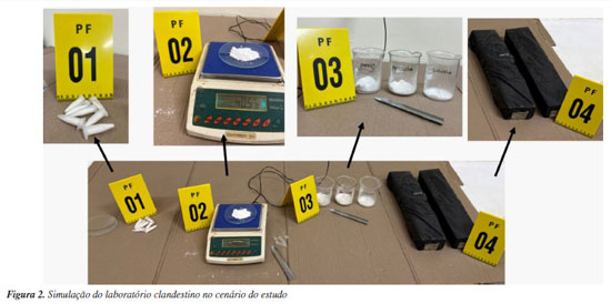 Simulação e análise do laboratório clandestino O cenário desenvolvido para esta pesquisa simulou uma situação em que um indivíduo manuseou drogas em um laboratório clandestino e deixou suas impressões digitais em diferentes superfícies do local. Para este cenário, os elementos representativos do laboratório foram dispostos conforme ilustrado na Figura 2, com todos os vestígios devidamente marcados. A impressão digital foi simulada ao depositar 10 µL de uma mistura oleosa, previamente preparada, sobre o dedo de molde de silicone, também previamente confeccionado. Após a secagem da mistura, foi pulverizado um grama do pó contendo quantidades iguais dos adulterantes da cocaína: benzocaína e cafeína.
