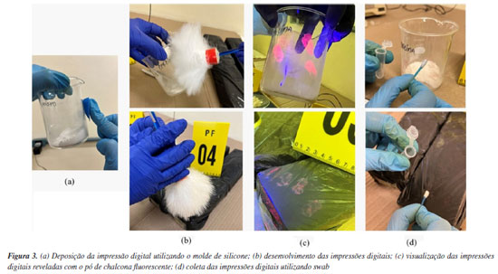 O dedo molde foi pressionado sobre uma superfície de vidro, de modo a transferir a impressão digital contendo a mistura oleosa e os adulterantes da cocaína. Após a deposição, a revelação da impressão digital foi realizada utilizando um pó revelador desenvolvido pelo nosso grupo de pesquisa para aplicação forense, composto por chalcona fluorescente.32 A coleta dos vestígios foi realizada com o uso de um swab, consistindo em um cotonete previamente umedecido com solvente extrator (clorofórmio). O cotonete foi esfregado sobre a superfície de vidro, de maneira a coletar o resíduo da impressão digital, juntamente com o pó revelador. Em seguida, o cotonete foi colocado dentro de um Eppendorf, o qual foi armazenado em um saco de evidências devidamente identificado. O processo de deposição, revelação e coleta das impressões digitais é ilustrado na Figura 3.
