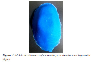 RESULTADOS E DISCUSSÃO A Figura 4 apresenta o molde de silicone confeccionado para o desenvolvimento deste estudo, evidenciando as linhas papilares da impressão digital com boa definição. A utilização de um molde de silicone no formato do dedo foi escolhida para simular as características de uma impressão digital, ao mesmo tempo em que preserva a privacidade e a segurança dos alunos. Para a confecção do molde, recomenda-se o uso da impressão digital de um professor ou outro membro da equipe de pesquisa, evitando a exposição dos alunos. Essa abordagem também elimina o risco de exposição direta dos alunos a substâncias químicas durante o experimento, assegurando tanto a qualidade dos resultados quanto o bem-estar dos envolvidos.