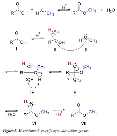 A composição química das impressões digitais é uma mistura complexa de compostos orgânicos, endógenos e inorgânicos, podendo conter contaminantes exógenos, como cosméticos, resíduos alimentares, medicamentos e drogas ilícitas. Essa composição é influenciada por diversos fatores, incluindo as características individuais do doador (como estilo de vida, idade e ocupação), as condições ambientais e tipos de substrato onde a impressão digital é depositada. Em função disso, há uma grande variabilidade na composição química das impressões digitais, o que dificulta a reprodutibilidade dos resultados obtidos em estudos científicos.11,12,19 Para abordar a relação entre ciência forense e química orgânica neste estudo, optou-se por preparar uma mistura oleosa contendo alguns dos principais ácidos graxos comumente presentes nas impressões digitais. No entanto, em uma análise de uma situação real, os ácidos graxos extraídos das marcas digitais precisam ser derivatizados para serem analisados por CG-EM. Essa derivatização é necessária devido à presença do hidrogênio ativo na hidroxila da estrutura desses compostos, que pode participar de diversas interações intermoleculares. Tais interações frequentemente prejudicam o processo de separação cromatográfica, resultando em fenômenos indesejáveis de adsorção entre interações da hidroxila do analito com as superfícies internas do injetor e/ou da coluna do cromatógrafo. Assim, derivando o grupo hidroxila dos ácidos graxos, aumenta sua volatilidade e estabilidade, melhorando as propriedades de separação e detecção desses compostos durante a análise cromatográfica.33 Desta forma, a mistura oleosa foi preparada contendo os ácidos graxos já nas suas respectivas formas derivatizadas, ou seja, na forma de ésteres, permitindo a abordagem da síntese desses compostos neste trabalho. Os ácidos graxos foram derivatizados por meio de uma reação de esterificação, empregando metanol (álcool de cadeia curta) como agente derivatizante na presença de ácido sulfúrico como catalisador. Esse processo permitiu a modificação estrutural dos ácidos graxos, resultando em ésteres correspondentes, compostos com menor polaridade e maior estabilidade térmica. Na reação de esterificação, inicialmente, ocorre a protonação da carbonila (I) pela doação de um próton do ácido. Em seguida, com a carbonila protonada (II), a carga parcial positiva no carbono da carbonila aumenta, fazendo com que o oxigênio do álcool (III) ataque o carbono da carbonila (II), resultando na formação de um intermediário tetraédrico (IV). Depois, a hidroxila do intermediário captura o hidrogênio ácido do oxigênio da molécula (IV), promovendo a estabilização dessa estrutura. Seguidamente, ocorre um rearranjo na qual a água (H2O) é eliminada (V), resultando na formação da carbonila protonada (VI). Finalmente, há a eliminação do hidrogênio ligado ao oxigênio da carbonila, levando à estabilização da carbonila e à formação do éster (VII). O mecanismo da reação de esterificação dos ácidos graxos foi adaptado e está representado no esquema da Figura 5.34