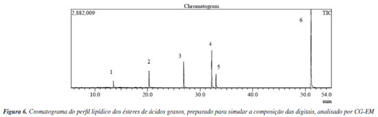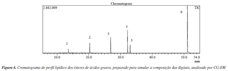 Após a obtenção dos ésteres purificados de cada um dos ácidos graxos, a mistura oleosa foi preparada por meio da combinação das diferentes proporções dos ésteres, conforme descrito na subseção “Síntese dos ésteres de ácidos graxos". A partir da impressão digital formada com o molde de silicone, foi realizada a extração do material, seguida da análise no CG-EM, com o objetivo de verificar se o perfil dos ácidos graxos selecionados seria reproduzido na análise. A Figura 6 apresenta o cromatograma dos ésteres dos ácidos graxos extraídos da impressão digital gerada com o dedo molde de silicone contendo a mistura oleosa. As proporções dos ácidos graxos, de acordo com a literatura, foram corretamente reproduzidas. A maior intensidade no cromatograma refere-se aos ésteres metílicos dos ácidos palmítico (3), seguido pelo ácido oleico (4), ácido esteárico (5), ácido mirístico (2) e ácido láurico (1), respectivamente. O pico identificado como (6) corresponde ao esqualeno.