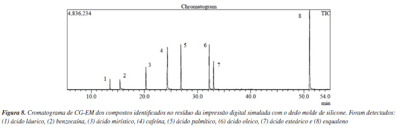 Ácidos graxos de cadeia longa, como ácido tetradecanoico, ácido palmitoleico, ácido palmítico, ácido oleico e ácido esteárico são normalmente encontrados em impressões digitais, com variações na frequência de sua presença entre diferentes doadores.35 As proporções variáveis de ésteres metílicos de ácidos graxos contribuem para a criação de um perfil único de cada indivíduo, permitindo classificações baseadas em gênero e raça, com base no perfil químico obtido.36 O ácido graxo palmítico é geralmente um dos compostos endógenos mais abundantes em resíduos de impressões digitais, seguido do esqualeno.11 Em um estudo sobre a composição química das impressões digitais depositadas em superfícies de vidro para fins de determinação de gênero, foram identificados onze compostos, incluindo ácidos graxos, ésteres metílicos de ácidos graxos, colesterol e esqualeno.37 No estudo de Poletti et al.,30 o perfil de ácidos graxos de impressões digitais latentes sebáceas foi investigado, demonstrando que as amostras eram compostas principalmente de ácidos graxos variando de C12 a C24, com os ácidos mais abundantes nas marcas de dedos sendo o ácido palmítico (C16:0), o ácido oleico (C18:1), o ácido mirístico (C14:0) e o ácido esteárico (C18:0). Consequentemente, as impressões digitais, após simulação da composição endógena e contaminação com adulterantes da cocaína, foram reveladas com o pó chalcona fluorescente, desenvolvido pelo nosso grupo. A técnica mostrou-se eficaz, evidenciando as impressões nas superfícies simuladas. A técnica de revelação de impressões digitais latentes por pós caracteriza-se por ser um método físico, onde as partículas do pó aderem ao material lipofílico da impressão digital, enquanto as demais partículas do resíduo da digital se ligam por forças de van der Waals com as partículas do pó, desde que estejam suficientemente próximos.38 A Figura 7 apresenta o resultado da revelação, com o pó aderindo adequadamente ao material lipofílico das impressões digitais, proporcionando um bom nível de detalhamento. A interação eficaz do pó revelador com as cristas presentes na impressão digital simulada com o molde de silicone sugere que essa impressão poderia, possivelmente, ser usada para identificar um suposto indivíduo em uma cena de crime. O material empregado para a revelação da impressão digital latente deste estudo apresenta baixa toxicidade, viabilizando sua utilização em laboratório de forma segura para os alunos. Após a revelação das impressões digitais, foi realizada uma nova extração, incluindo todos os resíduos presentes na impressão digital, como os ácidos graxos, o esqualeno, os adulterantes de cocaína (cafeína e benzocaína) e o pó revelador. Assim, foi possível observar na análise por CG-EM, qualitativamente, e em um único cromatograma (Figura 8), a presença e identificação dessas substâncias, evidenciando os vestígios deixados no local de crime simulado, um laboratório clandestino.