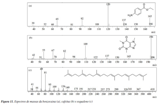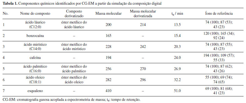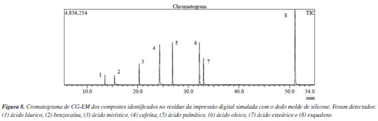 Extração da composição das impressões digitais e análise cromatográfica A extração dos componentes químicos presentes nas impressões digitais geradas a partir do molde de silicone foi realizada adicionando-se 1 mL de clorofórmio a um Eppendorf contendo o material coletado pelo swab. Em seguida, o Eppendorf foi fechado e agitado em um misturador vórtex por 30 s para extração dos compostos. Após a extração, o material foi transferido para um vial utilizando-se uma pipeta de Pasteur de vidro com um algodão na extremidade, permitindo a filtração do material antes da análise cromatográfica. A análise cromatográfica foi realizada em um cromatógrafo a gás Shimadzu QP 2020 Plus, equipado com injetor automático AOC-20i e detector por espectrometria de massas (CG-EM). Foi utilizado uma coluna Rtx-5MS (30 m × 0,25 mm × 0,25 μm), com temperatura inicial fixada em 100 ºC, que foi aumentada a uma taxa de 80 ºC min-1 até atingir 250 ºC, mantendo-se nessa temperatura por 5 min. A injeção foi realizada no modo split (1:50), com volume de 1 μL. O gás carregador foi hélio, com fluxo de 1,20 mL min-1. A interface e o detector foram mantidos a 200 ºC. A identificação dos compostos extraídos, incluindo ésteres metílicos de ácidos graxos, esqualeno, cafeína e benzocaína, foi realizada por comparação dos espectros obtidos com a biblioteca NIST (do inglês, National Institute of Standards and Technology) 2017.