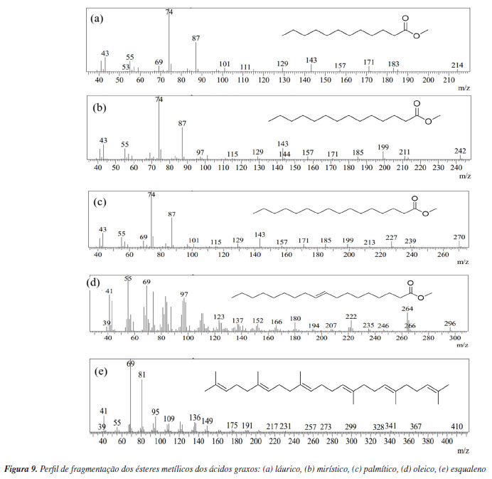 A cromatografia a gás é um dos métodos mais utilizados para investigações da fração lipídica de impressões digitais, sendo uma das técnicas mais difundidas dentro das ciências forenses.11,39 Trata-se de um método físico-químico empregado na separação de compostos voláteis e termoestáveis de uma amostra, que são separados baseados na diferente distribuição dos mesmos entre a fase estacionária líquida (imobilizada na superfície da coluna) e uma fase móvel gasosa. A programação da temperatura na coluna contribui para separação dos componentes devido a características como, volatilidade, ponto de ebulição, peso molecular e estabilidade térmica.39,40 Compostos mais voláteis eluem mais rapidamente da coluna cromatográfica, apresentando menores tempos de retenção ao passo que componentes com maiores pontos de ebulição eluem menos rapidamente, apresentando maiores valores de tempo de retenção. Cada espécie separada conforme a sua afinidade físico-química com a fase estacionária, é eluída seletivamente a um sistema de detecção, nesse caso, o espectrômetro de massas (EM), o qual permite a identificação de um composto pela comparação de seu espectro de massas a uma biblioteca ou por identificação da estrutura a partir de seus fragmentos.41 O princípio da EM é a ionização de uma molécula, onde seus íons são separados pela razão massa/carga (m/z) e cada fração numérica é registrada em um cromatograma de massas tendo o tempo de retenção da eluição de cada composto e a intensidade do sinal.42 As moléculas da amostra na fase gasosa são bombardeadas com elétrons de alta energia (geralmente 70 eV), removendo um elétron da estrutura, formando um cátion radical também conhecido como íon molecular M+, estrutura com elétron desemparelhado. Na sequência, o excesso de energia que é adicionado ao cátion radical recém-criado é tão grande que leva a quebra das ligações covalentes em fragmentos característicos do composto, formando o espectro de massas e, por isso, nem sempre é possível reconhecer o fragmento do íon molecular. O pico mais intenso do espectro de massas é chamado de pico base e tem arbitrariamente a intensidade 100%, enquanto que as intensidades dos demais picos, aparecem na forma de percentagens do pico base. O pico do íon molecular (o de massa mais alta) pode ser, eventualmente, o pico base.43 A Figura 9 apresenta os respectivos espectros de massas com padrão de fragmentação característico para os componentes da mistura oleosa (ésteres de ácidos graxos e esqualeno).