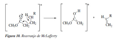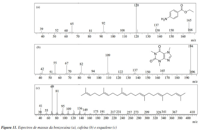 Para fins de exemplificação e didáticos, foi feita uma discussão de como analisar o espectro de massas do ácido graxo mirístico, no caso da estrutura derivatizada, éster metílico do ácido mirístico, a qual apresentou 97% de similaridade com o padrão de fragmentação da biblioteca NIST 2017, cujos principais íons de referência foram 74 (100%); 87 (55%); 43 (23%) e ainda o fragmento do íon molecular correspondente a massa molecular do composto M+ 242. O pico mais característico dos ésteres graxos é devido ao rearranjo de McLafferty com quebra da ligação β em relação ao grupo C=O (Figura 9). Assim, o éster metílico de um ácido graxo alifático não ramificado no carbono α produz um pico mais intenso em m/z 74, que é o pico base dos ésteres metílicos de cadeia linear na faixa de C6 a C26, correspondente ao fragmento CH2COOHCH3.43 A Figura 11 apresenta os respectivos espectros de massas com padrão de fragmentação característico dos componentes exógenos das impressões digitais, sendo eles a cafeína (Figura 11a) e benzocaína (Figura 11b). Para fins de exemplificação, foi feita uma discussão de como analisar o espectro de massas da cafeína, que apresentou 97% de similaridade com o padrão de fragmentação da biblioteca NIST 2017, onde o pico m/z 194 corresponde ao íon de maior intensidade referente ao íon molecular M+ da cafeína o qual também representa a massa molar do composto (194,15 g mol-1). No espectro de massas da cafeína, três íons caracterizam a molécula, sendo eles m/z 194, 109 e 67, cujas abundâncias características foram 100, 57 e 29%, respectivamente.44 A Tabela 1 apresenta a descrição de todos os compostos analisados no CG-EM.