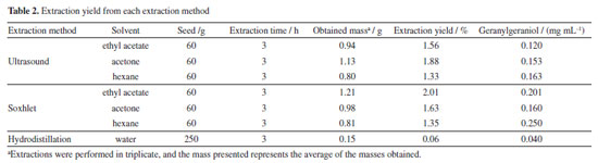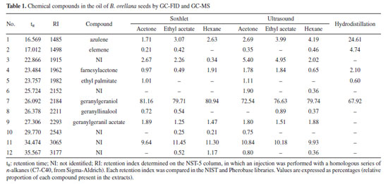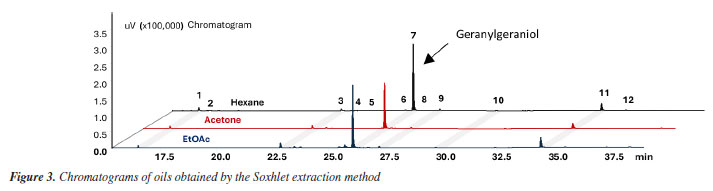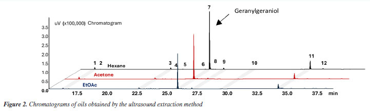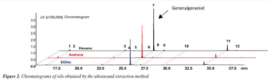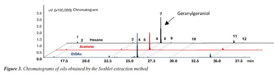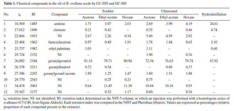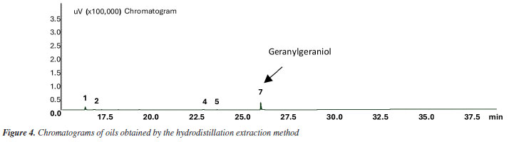 RESULTS AND DISCUSSION The extracts obtained from B. orellana seeds using the three techniques - hydrodistillation, Soxhlet, and ultrasound - were characterized by gas chromatography (GC-FID) under the same conditions. Figures 2-4 and 30S (in the Supplementary Material) show the chromatograms containing the profile of compounds obtained from annatto seeds oils from each technique, highlighting geranylgeraniol as the primary compound.