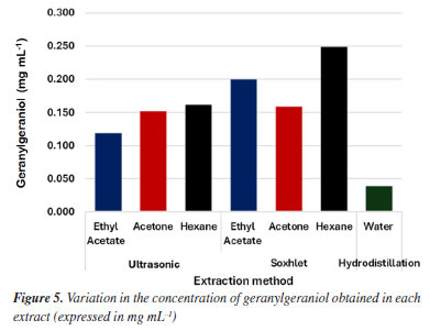 CONCLUSIONS Geranylgeraniol is an extensively studied compound that is mainly used for medicinal purposes. In agriculture, it has been studied as both an attractant and a pest repellent. For large-scale production, Soxhlet extraction using hexane as a solvent is an efficient way to obtain GGOH, since no post-extraction treatment is necessary. Better extraction yields with more polar solvents require a purification step. Ultrasound-assisted extraction is fast and efficient, with yields comparable to Soxhlet extraction. Acetone emerged as the most efficient solvent for this extraction technique. For direct consumption for medicinal purposes, the best extraction method is hydrodistillation, as it uses only water in the extraction process, avoiding organic solvents.