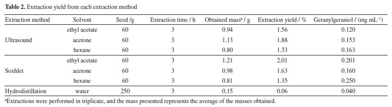 The oils obtained by Soxhlet and ultrasound-assisted extraction presented similar chemical composition, even in extractions using solvents of different polarities. In addition to GGOH, the main target component of the extraction, the following compounds were also obtained: azulene, farnesylacetone, and geranylgeranyl acetate (Table 1). Among the extracts, the main difference occurred in the extract obtained by hydrodistillation. Although it also had geranylgeraniol as the primary compound, it presented a higher concentration of azulene than the extracts obtained by the other techniques, approximately 25%, compared to a variation of 1 to 3% in the extracts with organic solvents. It also showed the presence of some minor constituents. In addition, it did not present the compound RI 3065 (Figures 4S, 8S, 12S, Supplementary Material), which is present in all extracts with organic solvents. This can be explained by the fact that hydrodistillation favors compounds with low molecular weight, which are more volatile.9,10 Due to this characteristic, the number of compounds in hydrodistillation is lower, with only four compounds identified (Figures 4 and 28S), as the heavier compounds are not easily dragged away, making the sample cleaner. However, the relative percentage of GGOH obtained is approximately 67%. In contrast, in extracts using organic solvents, the GGOH percentage varied from 72 to 79% in extracts obtained by the ultrasound technique and from 79 to 81% in extracts obtained by Soxhlet extraction (Table 1). Studies3 show that the presence of organic solvents significantly improves the extraction efficiency of bioactive compounds. Solvents with different polarities, such as hexane, ethyl acetate, and acetone, can obtain different compounds due to the stronger interaction between similar polarities. Despite this, the compounds obtained using the different solvents were practically the same, with terpenes and terpenoids generally being found. However, the amount of GGOH was higher in the Soxhlet and ultrasound techniques than in hydrodistillation, likely because these methods selectively extract specific compounds with organic solvents. Different solvents were also used to evaluate the oil yield obtained in each extraction. The extractions using organic solvents presented a higher oil yield than those carried out by hydrodistillation. For every 60.0 g of annatto seed, between 0.80 and 1.21 g of oil were obtained in the extractions carried out by Soxhlet and ultrasound, respectively, while in the hydrodistillation method using 200.0 g of seed, 0.15 g of oil was obtained. Table 2 shows the yields obtained for each extraction technique. It should be noted that the organic solvents acetone, ethyl acetate, and hexane increased the extraction efficiency by solubilizing lipophilic compounds like geranylgeraniol in a higher oil yield. The more polar solvents, ethyl acetate and acetone, presented better extraction yields; however, it was necessary to perform a treatment to remove bixin and norbixin with NaHCO3 solution, which, due to its alkalinity, can remove organic acid compounds. However, when hexane was used, with or without treatment, this removal procedure did not generate a difference in the extracted mass obtained, indicating that it is necessary to perform this process only with the more polar solvents.