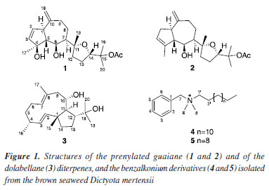 RESULTS AND DISCUSSION Chromatographic fractionation of the ethyl acetate extract from the brown alga D. mertensii led to the isolation and characterization of a new prenylated diterpene of guaiane skeleton (1), in addition to the already known diterpenes, dictyol H (2)12 and 10-acetoxy-18-hydroxy-dolabella-2,7-diene (3).13 Additionally, two ammonium quaternary salts (4 and 5)14 were also isolated (Figure 1).