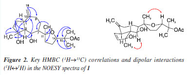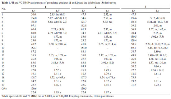 Diterpene 1 was isolated as a yellowish resin ( +65.76º c 0.1 MeOH). Its 1H NMR spectrum exhibited signals for olefinic protons corresponding to a carbon-carbon double bond having a cis-configuration dH 5.82 (dd, J 5.8, 1.8 Hz, H-2) and 5.68 (dd, J 5.8, 2.0 Hz, H-3) and an exocyclic double bond indicated by the methylidene proton singlets at dH 4.72 (s, H-18a) and 4.65 (s, H-18b), respectively. In addition, 1 showed resonances for two oxymethine protons dH 4.39 (dd, J 9.0, 3.2 Hz, H-6) and 3.84 (t, J 7.3 Hz, H-14), and two methine protons dH 2.95 (brd, J 9.0 Hz, H-1) and 2.23 (t, J 9.0 Hz, H-5) in a trans-diaxial arrangement characteristic of perhydroazulene fusion.15 In addition, signals for five methyl singlets, including one of an acetyl group at dH 1.95 (s) were observed. The 13C NMR spectrum showed signals corresponding to 22 carbon atoms compatible with an acetylated diterpene, commonly isolated from algae of the Dictyotaceae.16-18 The signals at dC 152.3 (C-10), 108.7 (C-18), 60.4 (C-5), and 50.0 (C-1) are typical of prenylated guaiane diterpenes.18,19 The combination of the 13C NMR CPD (composite pulse decoupling), and HSQC (heteronuclear single quantum correlation) techniques, revealed signals for a cis-disubstituted carbon-carbon double-bond dC/dH 135.0/5.68 (dd, J 5.8, 2.0 Hz, H-3) and 134.0/5.82 (dd, J 5.8, 1.8 Hz, H-2), and two oxymethine carbons 83.6/3.84 (t, J 7.3 Hz, H-14) and 69.0/4.39 (dd, J 9.0, 3.2 Hz, H-6). In addition, the 13C NMR spectrum exhibited signals for three oxygenated tertiary carbon atoms dC 97.1 (C-4), 87.2 (C-11), and 82.3 (C-15). The double bond at C2/C3 was assigned based on heteronuclear multiple bond correlations (HMBC) of H-2 (dH 5.82, dd, J 5.8, 1.8 Hz) with dC 97.1 (C-4), 60.4 (C-5) and 50.0 (C-1) while the hydroxyl groups at C-4 and C-6 was supported based on correlations of H-5 (dH 2.23, t, J 9.1 Hz) with dC 50.0 (C-10), 97.1 (C-4), 69.0 (C-6), 50.0 (C-1) and 22.8 (CH3-17). The relative stereochemistry of compound 1 was established through nuclear Overhauser effect spectroscopy (NOESY) correlations (Figure 2). Cross-peaks for H-6 and the α-oriented methyl group CH3-17, as well as for H-14 and CH3-19, indicate that these protons are located on the same face of the tetrahydrofuran ring.13 Additionally, the large coupling constants observed between H-1/H-5 and H-5/H-6 (J 9.0 Hz) support a trans-diaxial arrangement, reinforcing the proposed anti-relationship among these protons.