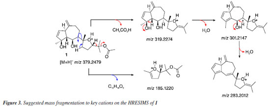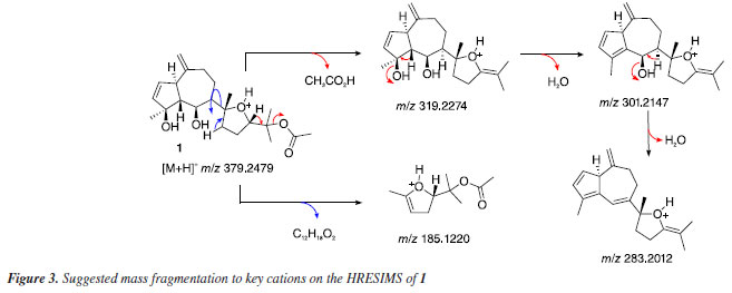 The molecular formula C22H34O5 (calcd. 378.2406 Da, six degrees of unsaturation) was determined based on m/z 319.2274 Da, corresponding to the loss of a neutral unity of acetic acid [(M-CH3CO2H) + H]+. The ion peaks at m/z 301.2147 Da [(M-H2O) + H]+ and 283.2012 Da [(M-2H2O) + H]+ showed a good match with the bicyclic moiety in agreement with the suggested structure (Figure 3). Thus, the structure of diterpene 1 was determined as a new diterpene of the prenylated guiane type, common in Dictyota species,20 and was named dictyol N due to its structural similarity to previously described dictyols and in accordance with the established naming sequence within this diterpene family.