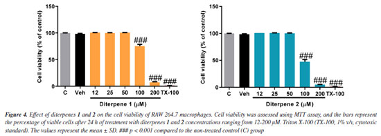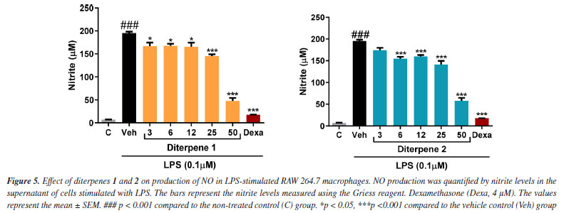 In the NO production inhibition assay, diterpenes 1 and 2 significantly reduced NO production. diterpene 1 effectively inhibited NO production at all tested concentrations (Figure 5). Conversely, for diterpenes 1 and 2 the most effective inhibition occurred at a concentration of 50 µM, achieving inhibition rates of 75 and 70%, respectively. Dexamethasone, used as a reference control, achieved a remarkable 91.18% reduction in NO production compared to the vehicle group.