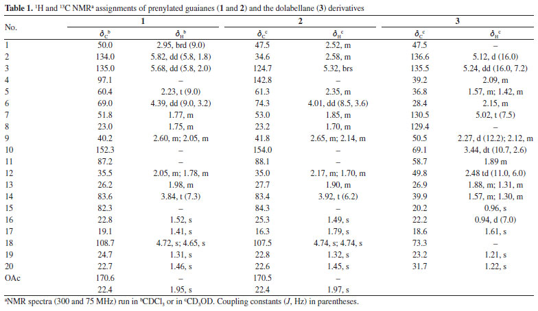 Neilyane de Paula FernandesI; Fábio do Nascimento ÁvilaI I. Departamento de Química Orgânica e Inorgânica, Universidade Federal do Ceará, 60021-970 Fortaleza - CE, Brasil Received: 02/28/2025 *e-mail: opessoa@ufc.br A chemical investigation of the brown seaweed Dictyota mertensii (Hoyt) Schnetter, Hörning & Weber-Peukert, a member of the Dictyotaceae, was carried out. The ethyl acetate extract led to the isolation of two prenylated guaiane, including a new one (1) and the known dictyol H (2). In addition, the dolabellane diterpene 10,18-dihydroxy-dolabella-2,7-diene (3) and two benzalkonium chlorides (4-5) were also isolated. The structures of all compounds were elucidated by an extensive analysis of their one- and two-dimensional nuclear magnetic resonance data (1D and 2D NMR), and high-resolution electrospray ionization mass spectrometry (HRESIMS). The cell viability and the anti-inflammatory activity of diterpenes 1 and 2 were evaluated against lipopolysaccharide (LPS)-stimulated RAW 264.7 macrophages. INTRODUCTION The marine ecosystem boasts remarkable biodiversity, with approximately 242 thousand described animal species and representatives of nearly all known animal phyla, highlighting its taxonomic richness and the ongoing discovery of new marine taxa.1 Among the countless living beings inhabiting this ecosystem, algae play an essential role as leading primary producers.2 Algae have numerous applications, including the food, cosmetic, and pharmaceutical industries.3 The Dictyotaceae is a large family of brown seaweed comprising approximately 349 species composed by 19 genera.4 Brown macroalgae, particularly those of the family Dictyotaceae, are prolific producers of secondary metabolites, accounting for more than 60% of the known compounds isolated from marine macroalgae.5 Dictyotaceae species are key components of benthic communities in tropical and temperate regions, including the diverse and extensive Brazilian coastline. With its extensive littoral, Brazil holds a rich and diverse marine ecosystem with a wide range of biological species, including brown macroalgae.5 The genus Dictyota comprises more than 94 taxonomically authenticated species and several species with uncertain classification.6 Previous chemical studies show that the genus is a major producer of secondary metabolites, moreover, compound-derived terpenes are the most abundantly found.5 Antiproliferative, antimicrobial, antiviral, antioxidant, anti-inflammatory, antihyperpigmentation, and chemical defensive activities have been reported for compounds from the genus.5,7-9 This study aimed to investigate the chemical composition of the extracts from the brown alga Dictyota mertensii collected at the sea coast of Ceará State, Brazil, and, as part of the collaborative work of the organic chemistry and pharmacology departments at UFC (Universidade Federal do Ceará), to search for the biological activity of the isolated secondary metabolites from natural sources, the anti-inflammatory potential of the isolated compounds was evaluated.