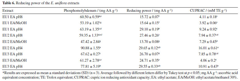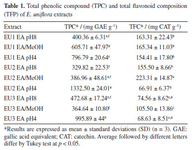 Vinicius Monteiro Schaffka; Cássia Gonçalves Magalhães* Departamento de Química, Universidade Estadual de Ponta Grossa, 84030-000 Ponta Grossa - PR, Brasil Received: 01/20/2025 *e-mail: cgmagalhaes@uepg.br Eugenia uniflora L (EU), Myrtaceae, known as pitangueira, is recognized as a source of bioactive compounds, mainly polyphenols. Considering the complexity and variety of factors that influence the composition of their extracts, assigning antioxidant properties to specimens from distinct locations and environmental conditions is important. In this study, the composition profile (total phenolic content (TPC), total flavonoid content (TFC), gas chromatography-mass spectrometry (GC-MS), and ultra-performance liquid chromatography-mass spectrometry (UPLC-MS) fingerprint) and antioxidant activity (by chelating effect, phosphomolybdenum, 2,2-diphenyl-1-picrylhydrazyl (DPPH), 2,2'-azino-bis(3-ethylbenzothiazoline-6-sulfonic acid) (ABTS), hypochlorous acid (HOCl), ferric reducing antioxidant power (FRAP), and cupric reducing antioxidant capacity (CUPRAC) assays) of the extracts from three specimens of pitangueira (EU1, EU2, and EU3) obtained at different pH values were compared. The results indicated that extracts obtained with ethyl acetate (EA) at pH 4 had the highest effectiveness due to their elevated levels of phenolic compounds. Additionally, a significant occurrence of flavonoids in EU2 was observed, as demonstrated by the antioxidant activity of EA at pH 8 and EA/MeOH (1:3). This study provides valuable insights into the chemical variability of E. uniflora and its significant impact on antioxidant activities, highlighting the importance of extraction conditions to enhance the therapeutic efficacy of its bioactive compounds. INTRODUCTION The search for compounds with antioxidant activity, whether of natural or synthetic origin, is of great relevance in promoting human health. The action of these substances is based on the containment of oxidative stress through the stabilization of reactive species.1 Reactive species are unstable compounds that can cause cellular damage and contribute to the development of various diseases, including cancer, cardiovascular disorders, and neurodegenerative diseases.2,3 Plant-derived antioxidants, such as polyphenols, offer significant benefits compared to synthetic compounds, considering that some of them show cytotoxic and carcinogenic potentials in in vivo assays.4 Their structural variety, combined with their greater safety, enables their application in the food and pharmaceutical industries. Polyphenols are classified as natural antioxidants due to their chemical characteristics. This kind of metabolite can directly capture reactive species, chelate metals, restore endogenous antioxidants, leading to protection against oxidative stress.5 Species of the Eugenia genus (Myrtaceae) display as a significant source of compounds with antioxidant action. Studies6 conducted with E. dysenterica highlight their neuroprotective action based on its efficacy in the balance of the action of biochemical markers of oxidative stress (catalase, superoxide dismutase activity, and lipoperoxidation). Eugenia uniflora L. (EU) is popularly known as pitangueira. It is a native Brazilian tree widely distributed throughout South America. In addition to the consumption of pitangueira's fruits in natura or their application in functional drinks, its leaves are used in infusions, decoctions, and tinctures for the treatment of diarrhea, stomach pains, worm infestations, fever, flu, hyperglycemia, hyperlipidemia, and hypertension.7-10 There are studies11,12 that point out the variability of the secondary metabolite composition of E. uniflora depending on the fruit color, ripening stage and seasonal influence. Variations in phenolic compounds have also been demonstrated based on tree maturation. The leaves extract of this plant is composed mainly of phenolic compounds, including phenolic acids, flavonoids, and glycosylated derivatives as the most prevalent.13,14 Many studies on E. uniflora attribute a range of bioactivities to its secondary metabolites and extracts, including antimicrobial, antiparasitic, anti-inflammatory, anticancer, neuroprotective and antioxidant properties. These bioactivities are primarily attributed to the high concentration and variability of phenolic compounds and flavonoids in the leaves' extracts.15-17 The antioxidant activity of E. uniflora extracts is the most described in the literature,18,19 and it is the main mechanism through which phenolic compounds and flavonoids exert other distinct bioactivities. Considering that the chemical profile of plant extracts is influenced by the ecosystem, the biological potential of their products will change.12 In this way, the phytochemical study of plants collected in different regions, as well as their biological properties, is relevant as it can guide harvesting based on the most interesting chemical compounds. Continuous research in this area is essential to explore the therapeutic potential of this species, considering factors that can influence its biological activities to ensure their quality is required for food and pharmaceutical industries. Therefore, the present work aims to evaluate the chemical profile and antioxidant potential of the leaves of E. uniflora specimens located in different environmental conditions.