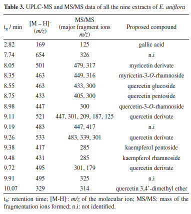 RESULTS AND DISCUSSION Characterization of the extracts The method of extraction and the kind of solvent can influence quantitatively and qualitatively the chemical profile of plant extracts. The initial extraction in a Clevenger-type hydrodistillator aimed to obtain the essential oil and remove apolar and non-phenolic impurities present in EU extracts. To ensure the complete exclusion of the non-phenolic portion, liquid-liquid extraction with CHCl3 was made. By raising the pH of the aqueous solution to about 8, the pKa of any phenolic hydroxyl present in flavonoids is not sufficiently low to guarantee deprotonation. However, carboxylic acid groups present in phenolic acids react with the base, forming their respective carboxylates. Under these conditions, liquid-liquid extraction with ethyl acetate (EA) will produce an extract rich in moderately polar flavonoids. The addition of a highly polar solvent, such as methanol, to this system favors the extraction of highly polar flavonoids, typically containing 3 to 5 hydroxyl groups and linked to glycosides. The subsequent acidification of the aqueous phase to pH 4 shifts the chemical equilibrium of the carboxylate groups back to their molecular form, which can then be extracted through liquid-liquid extraction with ethyl acetate. This sequence of liquid-liquid extraction aims to generate selective extracts for three classes of phenolic compounds: the EA extract at pH 8 containing moderately polar flavonoids, the EA/MeOH 30% extract containing glycosylated flavonoids, and the EA extract at pH 4 containing higher amounts of phenolic acids.32 The extraction process was more efficient for the EA pH 8 and EA/MeOH 30% extracts, with EU2 MeOH standing out, where the proportion of total flavonoids is the highest (Table 1). The extracts obtained with EA at pH 4 were more abundant in total phenolic compounds. The sample EU3 pH 4 stood out, because it not only contained a high amount of total phenolic compounds but also exhibited a small number of total flavonoids, showing considerable selectivity for the phenolic acids present in E. uniflora. It is possible to observe that the extracts obtained in EA/MeOH 30% showed the highest values of total flavonoid content, indicating that the flavonoids in E. uniflora leaves are in the most form glycosylated.