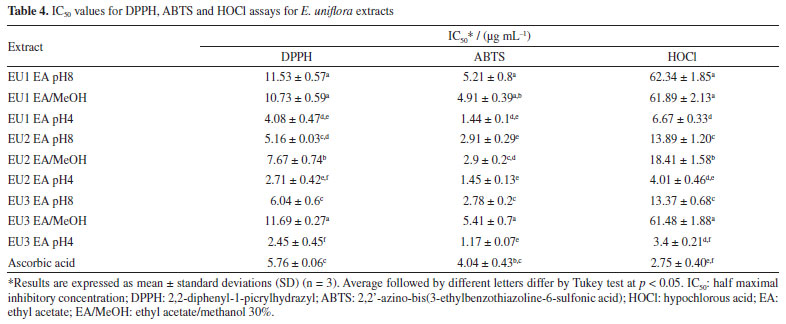 The fragmentation of the precursor ion at m/z 169 gives rise to fragment ion at m/z 125 (M-COO), indicating gallic acid.41 For quercetin glucoside ([M - H]- at m/z 463), quercetin-3-O-rhamnoside ([M - H]- at m/z 447) the ion fragment at m/z 300 is related to the respective radical aglycone ion, as well as for quercetin pentoside ([M - H]- at m/z 433),42,43 whose ion fragment at m/z at 405 was attributed to loss of CO, a typical pattern of these flavonoids.44 Myricetin-rhamnoside was annotated due to the presence of the deprotonated ion at m/z 463 [M - H]-, and a main fragment at m/z 316 was attributed to a myricetin radical anion resulting from the loss of the rhamnosyl moiety through homolytic cleavage.13 The formation of flavonol aglycone radical ions from flavonols during electrospray ionization mass spectrometry is a well-known phenomenon.45-47 Cone voltage experiments revealed that for some flavonol glycosides, ions at m/z 316, and 300 derive from the ions at m/z 317, and 301, respectively, by using higher cone voltages, whereas for other flavonol glycosides these ion pairs accumulate with the same cone voltages. It is suggested that 3-O-glycosylation favors formation of ions at m/z 300, and 316, whereas 4'- and 7-glycosylations favor formation of ions at m/z 301, 285, and 317.47 The loss of glycoside moiety for kaempferol pentoside ([M - H]- at m/z 417) and kaempferol rhamnoside ([M - H]- at m/z 431) justified the ion at m/z 285.42 Quercetin 3,4'-dimethyl ether was suggested due to observation of the precursor ion [M - H]- at m/z 329. The fragment ion at m/z 314 resulted from the loss of methyl moiety. There are several bioactivities that can be attributed to the E. uniflora due to the presence of previously identified compounds in its extracts, with a notable prevalence of glycosylated flavonoids and phenolic acids, such as gallic acid and glycosylated derivatives of flavonoids,16,48-50 as seen in Table 3. The flavonoids myricetin, quercetin, myricetin-rhamnoside, quercetin-pentoside, found in all the extracts are in line with the literature.7,10,13,16,49 The occurrence and concentration of phenolic compounds can change during the plant's development and in response to environmental factors.51 Factors such as saline and water stresses, and leaf mineral content trigger specific biochemical pathway expressions that enhance the content of their secondary metabolites as a mechanism for intracellular signaling, defense, and maintenance of homeostasis.11,52 Despite the visible difference in the constitution of the essential oils of the three analyzed specimens, there was no significant difference in the composition of the phenolic extracts. The volatile composition of E. uniflora appears to be more sensitive to environmental conditions than the phenolic composition for those specimens. Antioxidant activity of E. uniflora The results for DPPH, ABTS and HOCl assays were expressed as IC50 and are present in Table 4. All extracts strongly inhibited the DPPH radical. Furthermore, the leaves extracts obtained in ethyl acetate (EAF) at pH 4 were more efficient compared to the positive control, ascorbic acid. In ABTS assay, all the studied extracts were able to scavenge 50% of the ABTS radical at very low concentrations, with particular emphasis on the extracts EAF at pH 4, which yielded results at least three times lower than those of ascorbic acid. Regarding the scavenging of HOCl by E. uniflora extracts, significant activity was observed, particularly in the extracts obtained in EAF at pH 4, with extract EU3 pH4 showing the best result. The values obtained for EU1 EA pH8, EU1 EA/MeOH, and EU3 EA/MeOH differed from the others by presenting significantly higher IC50 values.