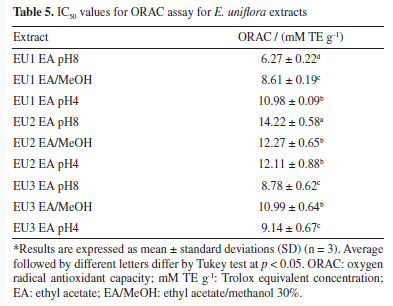 Those results can be directly correlated with the chemical composition of the extracts. Those with higher concentrations of total phenolic compounds exhibit the lowest IC50 for DPPH, ABTS and HOCl assay (DPPH Pearson's r: -0.69; ABTS Pearson's r: -0.68; HOCl Pearson's r: -0.52). A different trend for total flavonoid content was observed, which seems to decrease the potential of radical scavenging (DPPH Pearson's r: 0.45; ABTS Pearson's r: 0.34; HOCl Pearson's r: 0.31). The higher incidence of glycosylated flavonoids in E. uniflora extracts and the significant difference in antioxidant power between flavonoid glycosides and their respective aglycones may be the determining factor for this result, as already described in the literature.50,53,54 The ORAC method is based on the capture of the peroxyl radical (ROO ), formed by the thermal degradation of AAPH by the extract, preventing the loss of fluorescence due to the consequent oxidation of fluorescein. The samples evaluated exhibited a very distinct pattern in ORAC method. In this case, the increase of flavonoids is directly proportional to the improvement of antioxidant activity (Table 5). The EU2 EA pH8 extract stands out for its high content of total flavonoids and for exhibiting the highest ORAC value. That pattern can be explained by the correlation between the presence of 3', 4' catechol group in the flavonoid with the higher inhibition of lipid peroxidation.53,55