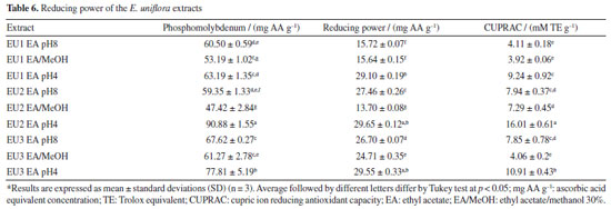 The reducing power of an extract reflects its electron-donating capacity. Extracts with reducing power in the presence of oxidizing agents will act by reducing them to more stable products, exhibiting antioxidant activity.1,54 For the determination of the reducing power of the extracts, three methods were employed. The evaluation of reducing power using the phosphomolybdenum method is carried out through spectrophotometric detection of the phosphomolybdenum complex Mo5+ in an acidic medium. Meanwhile, the assessment of ferric reducing antioxidant power (FRAP) is conducted through spectrophotometric detection of the Prussian Blue complex, formed by the reduction of Fe[(CN)6]3 to Fe[(CN)6]2 followed by the addition of FeCl3 to the reaction, forming the complex Fe4[Fe(CN-)6]3. The CUPRAC was also used to evaluate the reducing power of the extracts. This assay is based on the reduction of Cu(II) to Cu(I) by the extracts and it is measured by the complex formed with Cu(I) and neocuproine (2,9-dimethyl-1,10-phenanthroline). The results are presented in Table 6.