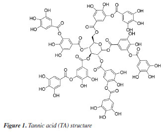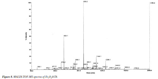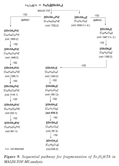 When a sample of Fe3O4@TA in water as dispersant was analyzed in a dynamic laser scattering device (DLS), a unimodal size distribution by number was obtained, as can be seen in Figure 7b. It shows particle diameter distribution at ca. 5 and 50 nm, and particles with a diameter 25.7 ± 13.3 nm are predominant. As such, the diameter determined by DLS analysis based on the diffusional properties of the particles is indicative of the apparent size of the hydrated/solvated dynamic particle,23,24 and it was to be expected that there would be a difference between the diameter thus determined with TEM and DLS analysis. The radius of the curvature effect is the main factor contributing to the large difference observed in DLS and TEM.25 At the size of around 25.7 nm the average hydrodynamic diameter is around 12.4 nm larger than the TEM size. Moreover, the standard deviation of DLS measurement of these particles also increased significantly to ± 13.3 nm compared to ± 2.1 nm found in TEM analysis (Figure 7a). MALDI-TOF-MS analysis Mass spectrometry (MS) is an interesting technique that allows detecting biomolecules without sample pre-treatment. Matrix-assisted laser desorption (MALDI) is a soft ionization method adapted for ionizing non-volatile analytes, such as biopolymers, and enables the production of intact molecule ions to be analyzed in a time-of-flight (TOF) mass spectrometer.26 With those insights, the nanocomposite Fe3O4@TA was analyzed by MALDI-TOF-MS to determine the presence of TA molecules. It was conceptualized that a molecule of TA is composed by a central glucosyl unit (Glc) condensed with five gallic acid (GA) dimers and, thereby, TA corresponds to the formula GlcGA10 (glucose-decagalloyl acid). Taking that into account, in the mass spectra of the MALDI-TOF (Figure 8) the molecular ion of m/z 1701.2 that corresponds to the molar mass of GlcGA10 was not detected, as expected. Instead, a peak at m/z 1752.2 for heavier chemical specie was noticed. This issue prompted us to come up with the inclusion of an iron atom as the parent ion at m/z 1752.2, which possibility the existence of an organometallic complex ion released when decomposition of Fe3O4@TA is induced in MALDI. We also considered both the multiple deprotonations of phenolic hydroxyls to produce a negative tannate (glucose-gallates) and its stabilization by FeIII coordination. In theory, tannins show a better ability for deprotonation than for protonation. This observation can be related to the fact that hydroxyl functional groups present in a tannin molecule are phenolic hydroxyls. Thanks to the stability of phenolate ion, deprotonation is favored (ca. pKa 10). In despite of the structure of the coordination compound formed cannot be established by means of MS, for our here assessment, the production of a [(GlcGA10)Fe]- (Figure 9) is chemically feasible and compatible for explain the principal signals in the spectra of Figure 8.
