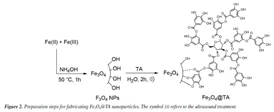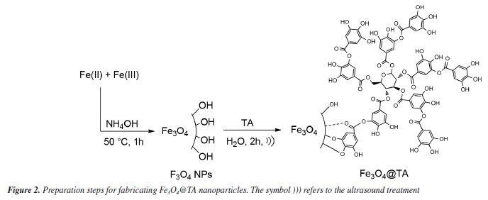 RESULTS AND DISCUSSION Synthesis of Fe3O4@TA Figure 2 outlines the synthetic route utilized for the creation of Fe3O4@TA. Initially, the process involved the synthesis of MNPs, followed by the subsequent grafting of tannic acid (TA) onto the Fe3O4 surface. The grafting procedure of TA was facilitated through sonication. Upon dispersing magnetite nanoparticles (MNPs) in the TA solution and subjecting them to a sonochemical process, it was noted that the TA concentration decreased to 105.3 mg L-1. This reduction in TA concentration implied that a portion of the phenolic compound was retained by the MNPs. This observation was further supported by the unchanged TA concentration in the control test where MNPs were absent.