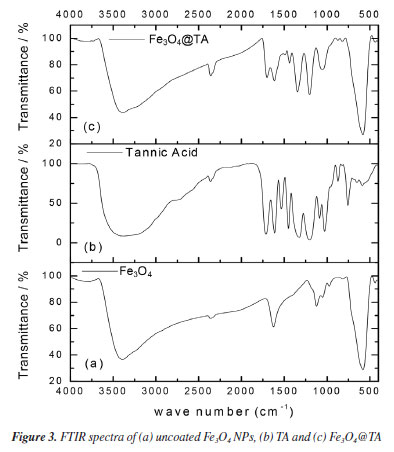 Based on these outcomes, it was deduced that the MNPs effectively engaged with TA, resulting in a decrease in their concentration in the liquid portion. Subsequently, the material obtained after ultrasonic treatment was purified, isolated, and dried to yield a black solid termed Fe3O4@TA, and external magnetic responsive. This solid was then reserved for subsequent studies. FTIR analysis The presence of TA in the nanohybrid was detected using FTIR. Figure 3 shows patterns of naked Fe3O4, AT and Fe3O4@TA. In accordance with theoretical calculations, the bond between TA and magnetite NPs is mediate mainly by -OH and carbonyl groups.18 In the FTIR spectrum, the low wave numbers (700-500 cm-1) come from stretching vibrations of the Fe-O of bulk magnetite (Figure 3a). The absorption band at 1636 cm-1 is due to absorbed water.13 Furthermore, the strong absorption band at around 3400 cm-1 is characteristic of O-H vibrational stretching. In pure TA (Figure 3b) the characteristic strong wide band of O-H stretching is observed. The FTIR also includes the band of C-O stretching at 1028 cm-1, the bands at 1200 and 1320 cm-1 due to stretching of C=C from aromatic system. The conjugated carbonyl group presents a strong signal at 1710 cm-1. Additionally, same bands at 1200 and 1320 cm-1 from C=C vibration, and those bands at 1610 and 1710 cm-1 due to C=O vibrational stretching for pure TA and the Fe3O4@TA.