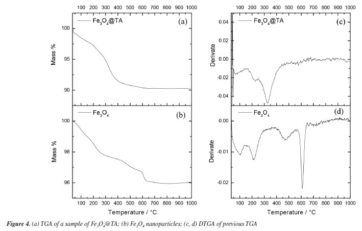 Thermogravimetric analysis As illustrated in Figure 4, the thermal behavior of Fe3O4@TA was analyzed using thermogravimetric analysis (TGA) and its first derivative (DTGA) (Figures 4a and 4b) revealing the presence of volatile organic constituents. The thermogram of MNPs (Figure 4a) displayed a mass loss of 4.00% occurring between 200 and 600 ºC. Initially, a weight loss of approximately 2.80% within the temperature range of 65 to 140 ºC was observed, attributed mainly to the desorption of water from the surface of the material. Subsequently, a broad weight loss of 9.95% was recorded within the 170-560 ºC temperature interval, indicating the decomposition of immobilized TA. More specifically, the temperature ranges of 170-270 ºC and 400-560 ºC were associated with the dehydroxylation process, as previously reported by Wu et al.19