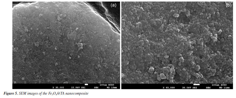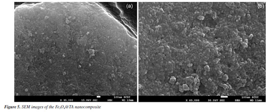 The thermograms in Figures 4a and 4b demonstrated evidence of the reduction of Fe3O4 to Fe and FeO within the temperature range from 570-650 ºC, with the peak occurring at 613 ºC, consistent with findings by Rudolph et al.20 Interestingly, the absence of this peak in the Fe3O4@TA thermogram implied that the decomposition products of TA might have a protective effect on the MNPs inorganic core. No further decomposition was observed at higher temperatures since the thermogram in Figure 4 indicated that no additional weight loss occurred beyond 650 ºC, indicating the complete decomposition of TA and resulting in an inorganic non-volatile content of 90.12%. In contrast, the Folin-Ciocalteau analysis indicates that the total polyphenolic content absorbed by the MNPs is approximately 19.73 mg. If we consider additive masses, the total would be 719.74 mg of Fe3O4@TA, which is equivalent to an organic content of about 2.70% m/m. However, the TGA reveals a value of 9.88%, which does not represent the organic content but rather the volatile fraction. This disparity may be attributed to factors associated with structural alterations on the surface of the bare MNPs by TA as mentioned before. The bare MNPs contain adsorbed water molecules on their surface, even after vacuum drying. Since the quantity of these molecules and the molar mass of the MNPs are unknown, it is not possible to establish a direct relationship between the chemical groups that can be substituted by polyphenols. It remains unclear whether polyphenols only replace water molecules or affect the ligand environment of iron(II) and iron(III) in the crystal structure. Therefore, correlating the results of the Folin-Ciocalteau assay with TGA is not straightforward. Furthermore, as mentioned previously, there is no well-defined temperature range that exclusively indicates TA decomposition. Given these uncertainties, we prefer to denote the final TGA residue as inorganic non-volatile content rather than the organic content in the form of TA, and Folin-Ciocalteau as a test to check the loss of TA in the reacting mixture. Electron microscopy images and dynamic light scattering analysis Scanning electron microscopy (SEM) is a tool for determining surface morphology of the nanocomposite. SEM images of Fe3O4@TA (Figure 5a) shows that no grain boundaries, terraces, or steps were observed, indicating that there was no significant growth of crystal domains at the expense of smaller nanoparticles through processes like Ostwald ripening or coalescence during the sonochemical process.21,22