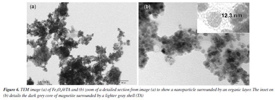 The nanohybrid appears to be formed by cauliflower-like particles setting an irregular and porous surface (Figure 5b). Moreover, the transmission electron microscopy (TEM) images (Figure 6) confirm that the nanoparticles exhibit a morphology characterized by a collection of spherical particles of nanometric size. The nanoparticles are observed as densely packed aggregates, which can be attributed to the presence of attractive forces among magnetite NPs. This aggregation is influenced by the presence of the TA layer (Figures 6a and 6b). The occurrence of van der Waals forces due to the organic capping on the nanoparticle surfaces contributes to the clustering into aggregated regions.