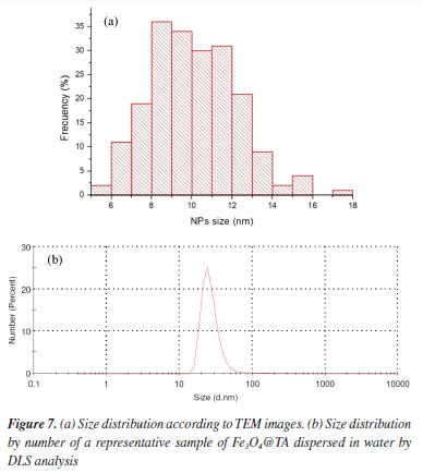 Despite the prevalent clustering, a thorough analysis of the TEM images enabled the determination of the size distribution of the nanoparticles, revealing an average diameter of 13.3 ± 2.1 nm (Figure 7a). This observation supports the notion that the magnetic core of the TA-modified magnetite nanoparticles consists of a single magnetite crystallite (depicted by dark gray spots in Figure 6b), encased by a lighter gray shell, as illustrated in the inset of Figure 6b.