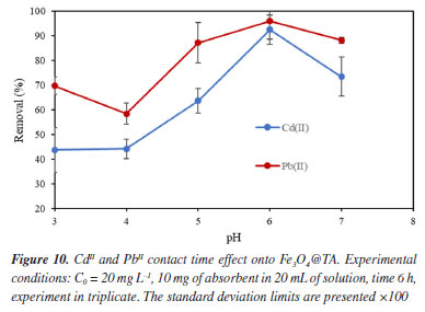 These insights lead us into a decomposition pathway to explain some of the peaks that appears in the spectra of Figure 8. The molecular ion [(GlcGA10)Fe]- readily produced by the loss of four protons and coordination with iron(III), undergoes into consecutive ester linkage breaks to release galloyl (152 molecular mass) fragments. As a result, a small signal at m/z 1600.2 is noticed which corresponds to [(GlcGA9)Fe]- (Figure 9) as denoted ion. In the present pathway, the oncoming loss of galloyl fragments was expected. Indeed, the sequentially loss of 2, 3, 4, 5, 6 galloyl units yield the ions with m/z 1448.2, 1296.1, 1144.1, 993.1 respectively, until tetragalloyl-glucose at m/z 841.1 (Figure 9). The m/z 620.1 fragment was assigned to a coordination compound formed by iron and three CHA molecules (CHA-Fe, C30H18N3O9Fe), where CHA (α-cyano-4-hydroxycinnamic acid) functions as the MALDI-TOF matrix. It is well established that CHA can coordinate with metal ions to form cluster derivatives, and the fragments corresponding to [3M] (M = CHA fragment) complexes are commonly observed in MALDI-TOF spectra. In our study, CHA effectively chelates the iron ions released from the magnetite core, a phenomenon that has been documented in a previous investigation.27 On the other hand, affinity of iron ions for bidentate aromatic carboxylates results in stable coordination compounds as expected.28 These studies have demonstrated the capability of CHA to form stable metal clusters, supporting the assignment of the m/z 620.1 fragment to a CHA-Fe coordination compound. Another consequence of the galloyl sequential loss approach is the presence of iron free galloyl-glucose derivatives. The direct ionization of Fe3O4@TA into [GlcGA10]- which caused the loss of one and two galoyl fragments, was considered possible, although it was not detected. However, the so expected octagalloyl-glucose [(GlcGa8)]- (m/z 1395.2) shows consistent mass loss of galloyl moieties to heptagalloyl-glucose (m/z 1243.2), hexagalloyl-glucose (m/z 1091.2), pentagalloyl-glucose (m/z 939.2), tetragalloyl-glucose (m/z 787.2) and trigalloyl-glucose (m/z 635.2); being [GlcGA5]- the most abundant product ion. For additional information, see Supplementary Material where Table 1S shows the mass error and m/z from formula of the present study and Figure 1S depicts the complementary MALDI-TOF-MS spectrum. In this regard, the MALDI-TOF analysis demonstrates the integrity of the TA layer on the magnetite nanoparticles and its affinity by the ionized iron species. CdII and PbII adsorption assays To describe a sorption process for the system were Fe3O4@TA is the sorbent, several batch experiments were conducted, in which, solutions of variable concentration of CdII and PbII were treated with an amount of sorbent. Figure 10 depicts the impact of pH on the sorption of CdII and PbII. It was evident that the removal efficiency of both CdII and PbII experienced a significant increase from pH 3.0 to pH 6.0 for CdII, and up to a maximum sorption level at pH 6.0 for both PbII and CdII. Following this, the sorption of these metals sharply declined. This can be explained by the fact that at low pH levels, the surface of Fe3O4@TA was surrounded by hydronium (H3O+) ions, leading to a reduction in the interaction between CdII and PbII with the adsorption sites of Fe3O4@TA due to repulsive forces. Consequently, the adsorption capacity decreased at lower pH levels.