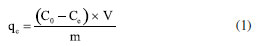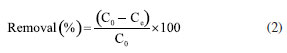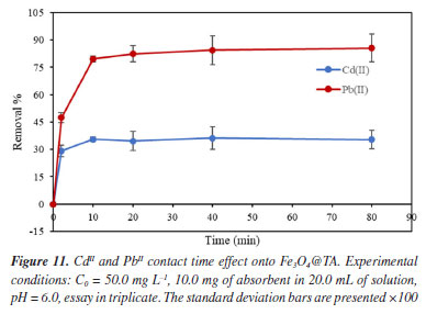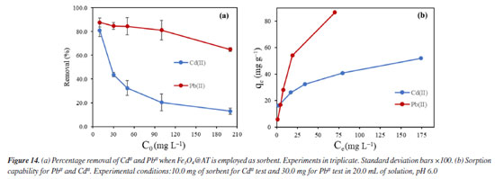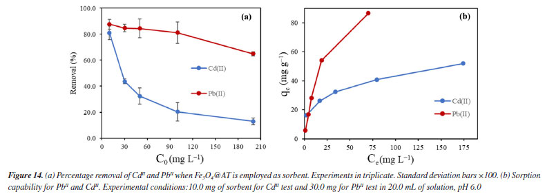 The results shown in Figure 14 refers to the change of concentration of the diluted metal ions presented as the removal (%) when the Fe3O4@TA is used. A progressive decrease in the removal percentage was observed as function of the increase concentration of contaminants in both cases. This is expected since the sorbent is promptly saturated by the sorbate with increasing concentration. If Ce versus qe (Equation 1) is plotted, a higher affinity for PbII is advised as a fact of the maximum qe for PbII against CdII. Given that the sorption capacity is directly influenced by the saturation of the adsorbent, it was deemed appropriate to increase the quantity of nanoparticles utilized for the PbII.