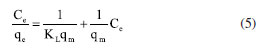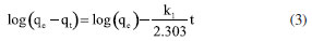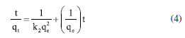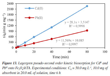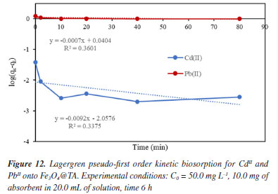 In Figures 12 and 13, the linear plots of log(qe-qt)versust are presented for the Lagergren pseudo-first order model, and t/qt versust for the Lagergren pseudo-second order model regarding the biosorption of CdII and PbII using Fe3O4@TA as sorbent. The pseudo-second order equation exhibited a solid fit to the experimental data, with a high correlation coefficient (R2) close to unity (Figure 13), in contrast to the first-order model (Figure 12). The slight deviation from the straight line within the initial 30 min of sorption (Figure 12), as observed for the pseudo-first order model, was attributed to the rapid initial uptake of PbII and CdII onto Fe3O4@TA followed by a slower adsorption process. Based on the correlation coefficients, it can be concluded that the sorption of CdII and PbII by the Fe3O4@TA nano-sorbent follows a global second-order reaction pathway.31 The later kinetic model gave an equilibrium rate constant (k2, Equation 4) of 0.0194 g mg-1 min-1 for CdII and 0.0134 mg-1 min-1 for PbII.