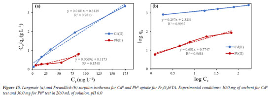 Despite the TA-magnetite core-shell adsorbent demonstrating the highest adsorption capacity (entry 5, Table 1), its synthesis exhibits several drawbacks. The protocol necessitates the use of a corrosive precursor, FeCl3, and requires additional solvents such as ethylene glycol, along with prolonged thermal treatment at 200 ºC for 24 h versus ultrasound shorter process. Furthermore, the resulting hybrid material has a mean particle size exceeding ca. 500 nm, which may limit its applicability in systems where nanoscale dimensions are advantageous. The good adsorption capability, favorable pH-dependent adsorption, and multilayer uptake of CdII can be directly linked to well-defined nanostructure of the nanocomposite, as observed by SEM and TEM, and the active, TA-derived binding sites confirmed by FTIR and MALDI-TOF. The TGA analysis further supports the stability and presence of the organic layer essential to the adsorption process. It was noted that the elevated removal percentage and sorption capability observed for PbII are linked to the greater mass of adsorbent used for this metal. Similar findings were reported by Qiu et al.,33 who attributed the exceptional adsorption performance of TA to the strong coordination interactions between PbII and phenolic hydroxyl groups, ester functionalities, as well as the specific affinity of TA for PbII.34 To gain a deeper understanding of the sorption mechanism, we applied the Langmuir and Freundlich models. Analyzing the data from Equations 5 and 6, we constructed linear plots, and these are presented in Figure 15. Comprehensive data from both models are listed in Table 2. Notably, the sorption process aligns more effectively with the linear form of the Freundlich equilibrium isotherm, depicted in Figure 15b. This yielded R2 values of 0.9937 and 0.9684 for CdII and PbII, respectively.