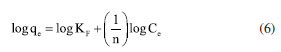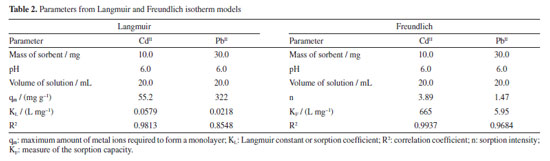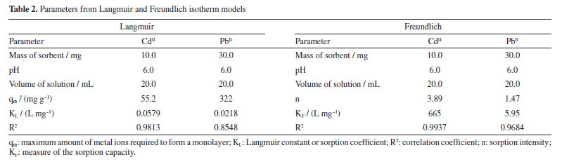 From this, we can deduce that the exclusive assumption of a homogeneous monolayer adsorption mechanism, as suggested by the Langmuir isotherm, may be inaccurate for surface sorption of metal ions.36 The Langmuir model assumes equal affinity for the adsorbate across all binding sites, limitation to monolayer formation, non-exceedance of the number of adsorbed species beyond total surface sites, and no lateral interactions between adsorbed species. These assumptions, particularly in adsorbate based on biomolecules, may hold untrue. Hence, the Freundlich better fit the data, accounting for non-identical adsorption binding. This alignment was expected since TA, being a polyphenolic macromolecule, possesses non-homogeneous binding sites for the adsorbate. Notably, the sorption intensity "n" (Equation 6) for both CdII and PbII sorption exceeded 1, indicating a favorable process.