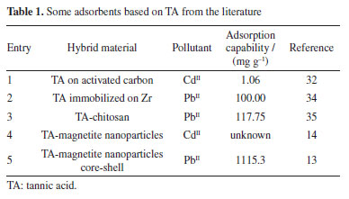 MNPs are derived from cost-effective materials through a straightforward synthesis process conducted in water, and their properties can be easily tailored through structural surface modifications in a post-precipitation approach.11 These attributes contribute to cost reduction and enhanced availability for large-scale applications. Our research focuses on a green route to increased availability for large-scale applications. While existing literature explores the use of MNPs and TA as adsorbents for metals in aqueous effluents, it is imperative to highlight the distinctive synthetic process developed in this study. Specifically, prior studies12-14 have employed direct MNP synthesis with core growth in the presence of a coating agent through coprecipitation methods. In contrast, our investigation uses a post-precipitation synthesis approach assisted by ultrasound. Each type of material discussed in the literature presents unique properties regarding adsorption behavior and involves different preparative methodologies. Therefore, it becomes essential to characterize the obtained material, even when the precursors are identical. In the materials science, seemingly minor variations in synthetic pathways can result in entirely distinct materials. Our study aims to contribute nuanced insights by adopting a modified synthesis strategy, enhancing the understanding of MNPs and TA as potential adsorbents in wastewater treatment. Additionally, stable precursors for the magnetite core were utilized, as sulfate salts are less corrosive compared to chlorides often used in related literature. In the context of this study, significant contributions are made in terms of the chosen adsorbent CdII and PbII in water, the ultrasound-based synthesis method for surface modification, the structure of the surface and the focus on experimental variables related to adsorption. In this regard, the adsorbent material synthetized was applied to laboratory-simulated solutions.