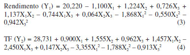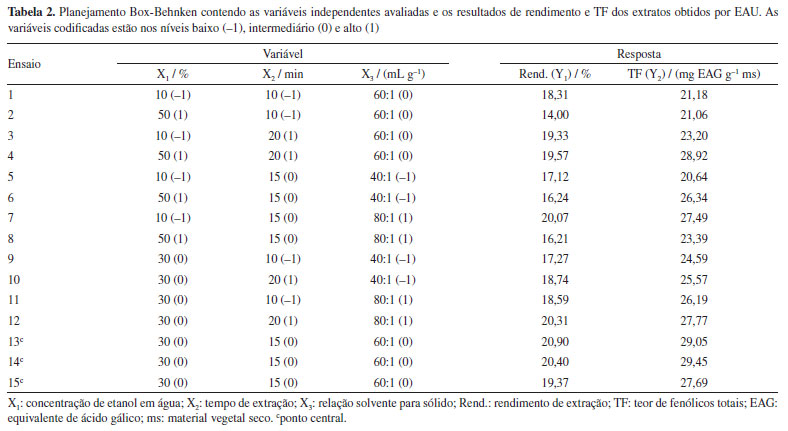 RESULTADOS E DISCUSSÕES Otimização por EAU Para determinar as condições ótimas de extração das folhas de L. alba por EAU e avaliar os efeitos das variáveis estudadas no rendimento e no TF dos extratos obtidos, foi utilizado um planejamento Box-Benhken como uma metodologia de superfície de resposta. Esse planejamento e as respostas obtidas nas diferentes condições de extração avaliadas estão mostrados na Tabela 2, na qual pode ser observado que os rendimentos de extração variaram entre 14,00 e 20,90% e os valores de TF variaram entre 20,64 e 29,45 mg EAG g-1 ms.