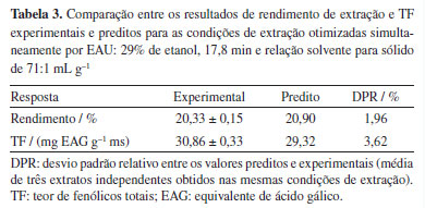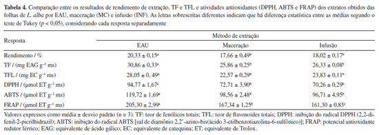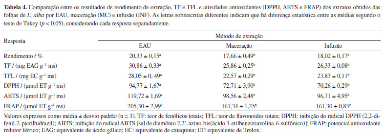 Os valores de rendimento e TF experimentais e preditos para EAU mostrados nas Tabela 3 foram muito próximos, apresentando baixos desvios relativos: 1,96 e 3,62%, considerando o rendimento e o TF, respectivamente. Esses resultados indicam que os modelos propostos explicam adequadamente os processos de extração e possuem alta capacidade de prever o rendimento e o TF, de forma simultânea, além de predizer a concentração de etanol, o tempo de extração e a relação solvente para sólido mais adequada para a EAU.22,29 Comparação entre EAU, extração por maceração e extração por infusão A Tabela 4 mostra a comparação entre os resultados de rendimento, TF e TFL dos extratos obtidos das folhas de L. alba por EAU (nas condições de extração otimizadas), maceração e infusão.