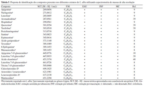 Fenilpropanoides, flavonoides e iridoides têm mostrado diversas atividades biológicas, incluindo atividades antioxidantes. O composto acteosídeo tem efeitos antioxidantes, anti-inflamatórios, neuroprotetoras, hepatoprotetoras, anticâncer e antidiabéticas relatados na literatura.42-44 A hispidulina demonstrou importantes atividades anticâncer, anti-inflamatória, tripanocida, leishmanicida e antiepiléptica.45-47 Iridoides demonstraram atividades biológicas promissoras, como propriedades antioxidantes, antitumorais, antifúngicas, antivirais, anticâncer, antidiabéticas, hepatoprotetoras, anti-inflamatórias, neuroprotetoras e antileishmania.48-51 Portanto, os perfis metabólitos encontrados nos extratos de L. alba demonstram o grande potencial biológico e econômico desta espécie.