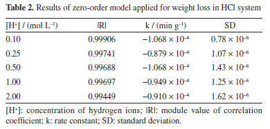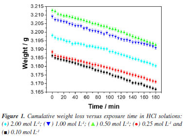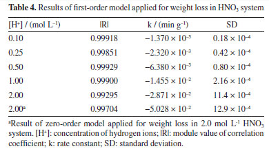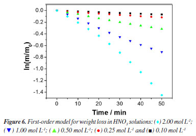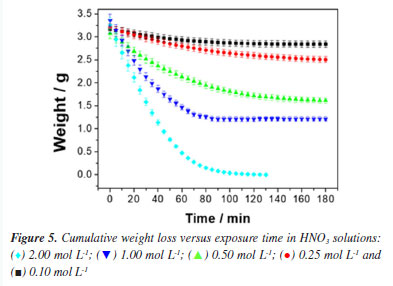SUPPLEMENTARY MATERIAL Complementary material for this work (experimental data on weight loss, pH, conductivity, and modeling of weight loss in HCl and HNO3 media) is available at http://quimicanova.sbq.org.br/, as a PDF file, with free access.