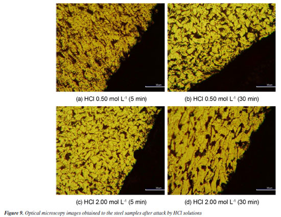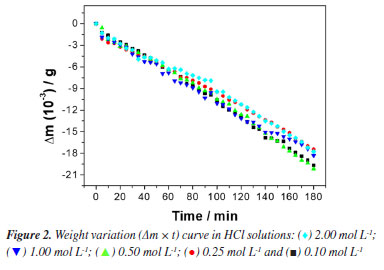 EXPERIMENTAL Carbon steel sample preparation A sample of carbon steel 1020 (Usiminas) with a composition of 0.184% C, 0.037% Mn, 0.026% P, 0.021% S and rest being Fe was used for the studies. The samples were well and successively polished with SiC papers of P120, P180 and P220 grits, to achieve a smooth mild steel surface, and then washed thoroughly in distilled water. The polished surface was cleaned carefully with distilled water and acetone to expose the microstructure, remove polishing residuals and possible grease. After preparation and cleaning, the specimens were allowed to dry in air before further use. Corrosive medium (acid solutions) Different concentrations of aqueous HCl and HNO3 solutions were used as corrosion media to investigate the corrosion behavior of carbon steel substrates. The samples were exposed to 0.1, 0.25, 0.50, 1.00 and 2.00 mol L-1 solutions of HCl or HNO3, throughout different immersion times, at room temperature (20 ± 2 ºC). All reagents used in the study were analytical grade chemicals. Weight loss assays The corrosion of mild steel in acids solutions was investigated at room temperature using weight loss measurements, which were taken using the procedures and precautions described elsewhere.33,34 The test samples were suspended in the apparatus for complete immersion in the acid solutions. The exposure was observed for 180 min while the weight loss measurements were taken at every 5 min intervals using the electronic digital weighing balance Shimadzu, which has a sensitivity of 0.01 mg and a standard deviation of ± 0.02 mg. The weight of each sample was measured before immersion, and then measured after 5 min of immersion in the medium to obtain weight loss. The weight loss measurements were recorded at 5-min intervals until the complete immersion period, and the results obtained are presented in the form of cumulative weight loss. pH measurements The pH meter (Instrutherm, PH2600 model) equipped with a glass electrode combined with an external Ag/AgCl (3.0 mol L-1 KCl) reference electrode and calibrated with standardized buffer solutions (pH = 4.0, 7.0 and 9.0) was used to study the acidity of the corrosion medium throughout the weight loss assays. The combined glass electrode was thoroughly washed with distilled water before subsequently immersed in the respective acidic solutions. The readings were taken at the stable points of pH and these values were recorded at an interval of 5 min. Conductivity measurements The conductivity meter (Tecnopon, MCA150 model) calibrated with a standard solution (146.9 μS cm-1) was used to study the conductance of the corrosion medium. The conductivity cell was immersed in the distilled water and shaken before being subsequently immersed in the acid solution. The readings were taken at the stable points of the conductivity and these values were recorded at an interval of 5 min. Electrochemical measurements Electrochemical measurements were performed using a potentiostat/galvanostat equipment (Metrohm, model PGSTAT 128N) managed by Nova software, version 2.1.5. A three-electrode electrochemical cell was used, consisting of a carbon steel test specimen as the working electrode, a Pt plate as the counter electrode, and an Ag/AgCl (3.0 mol L-1 KCl) reference electrode. As a corrosive medium, HCl and HNO3 solutions with concentrations of 0.1, 0.25, 0.5, 1.0 and 2.0 mol L-1 were used. The potentiodynamic polarization curves were obtained by applying the linear sweep voltammetry (LSV) technique with a potential window of -0.8 to 0.0 V and a potential scan rate of 1.0 mV s-1. All polarization curve measurements were performed after measuring the open circuit potential (OCP) for 0.8 h to ensure its complete stabilization. Microstructural studies The microstructures of mild steel surfaces before and after immersion (at 5 and 30 min) were analyzed using an optical microscope (Kontrol, IM713 model). All micrographs of the specimen were taken at a magnification of 100× and 200×, respectively.