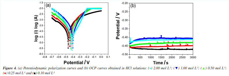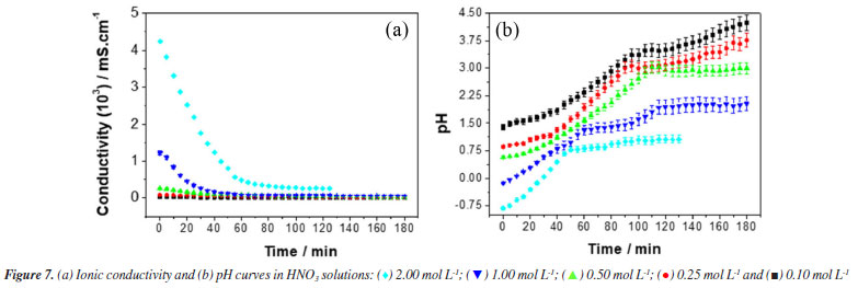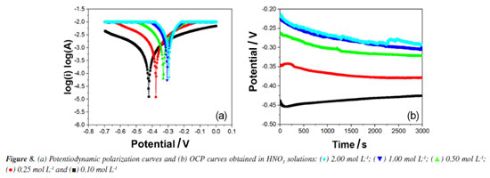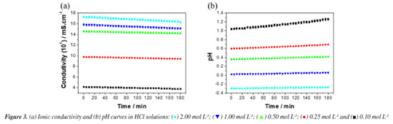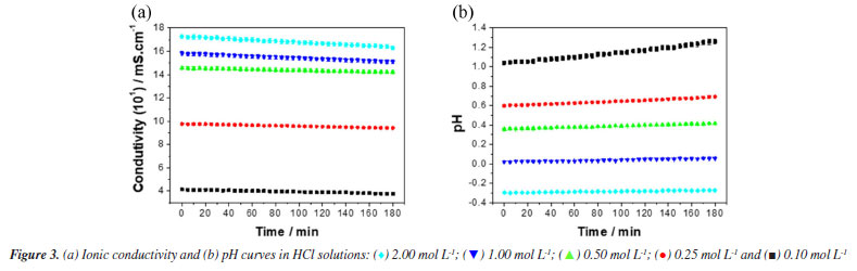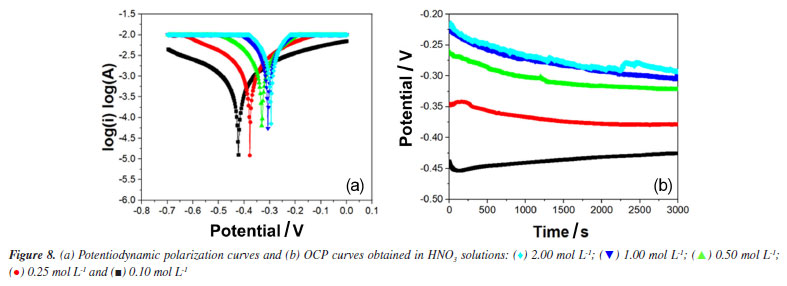 Figure 7a shows an exponential decay of ionic conductivity in the first 60 min of exposure of steel to corrosive medium (HNO3), in all studied concentrations. This decrease in ionic conductivity was attributed to the difference in the ionic diffusion coefficient between H+ and Fe2+ ions.40,41 After this initial period, the ionic conductivity remains practically unchanged, which we attribute to the passivation of the steel by nitrate ions.44,45 These results corroborate those observed in the weight loss experiments. The evolution of pH with the time of exposure of the steel to the corrosive medium containing HNO3 solutions in various concentrations is shown in Figure 7b. For the concentrations of 0.10, 0.25 and 0.50 mol L-1 an exponential increase in pH is observed up to approximately 100 min. At this point, an inflection occurs, and the pH continues to increase much more slowly. For concentrations of 1.00 and 2.00 mol L-1, two inflections are observed: one at 60 min and another at 100 min. These inflections were attributed to the formation of the passivation layer on the steel surface due to the presence of nitrate ions.44,45 According to Figure 8a, a notable characteristic of these polarization curves is that the hydrogen evolution reaction (cathodic curve) was significantly accelerated with increasing HNO3 concentration. Figure 8b illustrates that, after 15 min, the potential values for various HCl concentrations evolved towards stabilization.