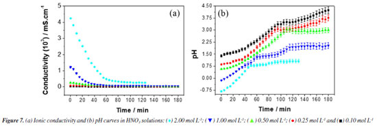 The results observed in Figure 6 and Table 4 show that for all concentrations the experimental data fit well with a first-order kinetics model. However, for the 2.00 mol L-1 concentration, a zero-order model was also proposed, which presented a slightly improved correlation coefficient. This observation can be correlated with the fact that, at high concentrations, the steel surface becomes saturated. As performed in the HCl case, the corrosive process taking place in HNO3 medium was also monitored by ionic conductivity and pH measurements. The data recorded in this case are provided in Figure 7 (for a more detailed analysis, see the Supplementary Material).