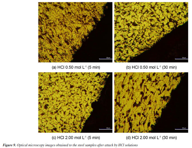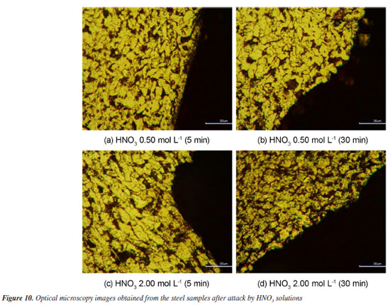 Figure 9 demonstrates that neither the exposure time nor the variations in the concentration of the acid solutions caused significant changes in the morphological characteristics of the corroded surfaces. In other words, regardless of the contact time of the material with the solutions or the acid concentration, the morphology of the corroded surface remains quite uniform. This indicates that the corrosion dynamics did not undergo major variations with the increase in the exposure time or concentrations, indicating relatively stable corrosion behavior under the experimental conditions. Additionally, the results obtained indicate that, in the acid pickling process, the exposure time plays a critical role in obtaining a metal surface with uniform morphological characteristics. It was observed that prolonged exposures do not promote significant improvements in the removal of oxides or impurities, and may even compromise the surface integrity of the material. Thus, shorter exposure times proved to be more effective, promoting controlled and homogeneous pickling, as evidenced in the micrographs presented. Figure 10, however, depicts an alteration in the attacked surface, which had its rugosity increased as exposure time went by. This behavior was best observed in the 0.50 mol L-1 concentration. Nevertheless, morphological variation in the assessed surface related to changes in concentration could not be observed in the metallographic images. Comparing Figures 9c and 10c of the two samples that were put under the same concentrations at the same time intervals for both kinds of acids in study and as indicated in Figure 10b, HNO3 seems to operate as a solvent to the cementite contained in the perlite. Therefore, the phenomenon of solubility may be the reason why the corrosion rate for HCl differs from the observed in HNO3, which has its reaction order increased. The increase in the contact surface of the steel, due to solubility of cementite phase by the HNO3 medium, could prevent the occurrence of saturation of steel surface, differently from the observed in HCl solution.
